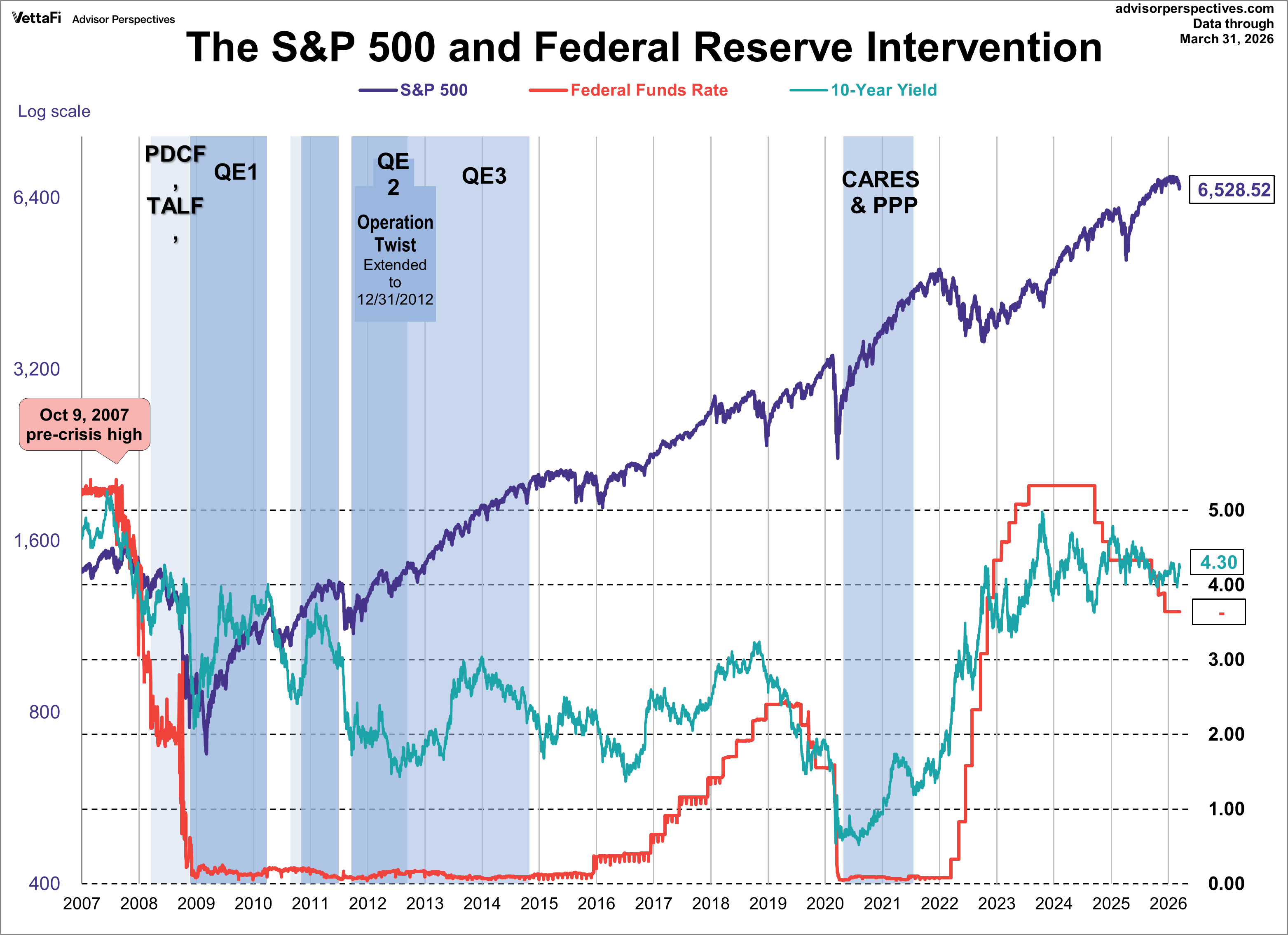 It’s not obvious that the Fed has done a great job stimulating the economy. However, even during periods of high interest rates, such as the late 1980s and the recent period of rates being at a 20 year high, the S&P 500 has demonstrated resilience and achieved record highs. Our last chart shows the 10-year yield’s daily closes against the S&P 500 with some notes on Fed intervention.