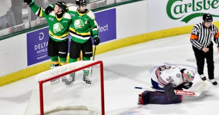 Oliver Bonk gave the Knights a 3-1 lead at 8:36 of the second period just after a London power play had ended as he wired a wrist shot over the shoulder of Oster and through a tiny opening. Cowan picked up an assist on that play as well.