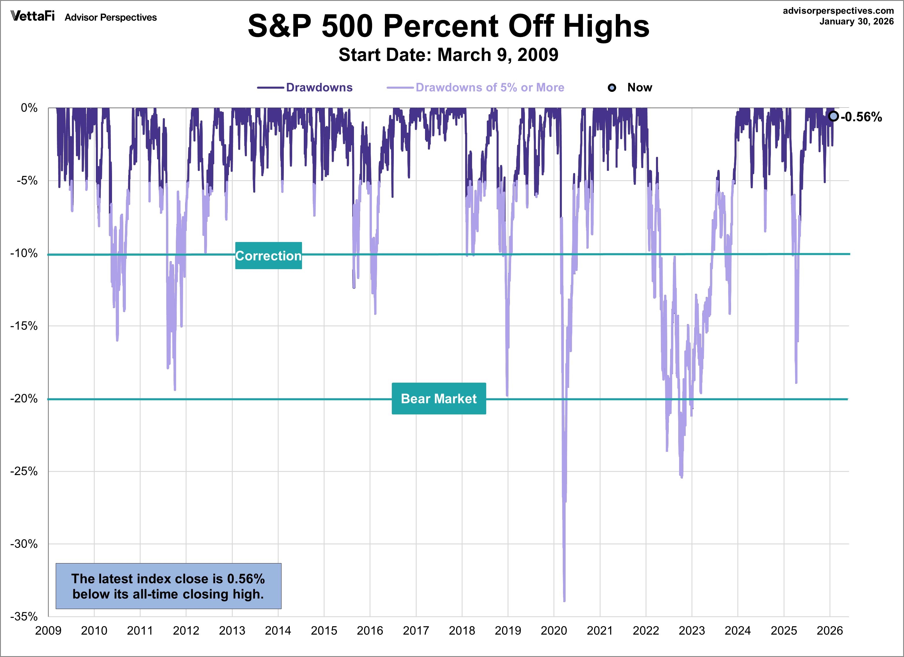 What happens if we take out the Global Financial Crisis? Here’s a snapshot the same chart above where the start date has been changed to the trough reached on March 9, 2009. Note the recent selloffs in 2022.