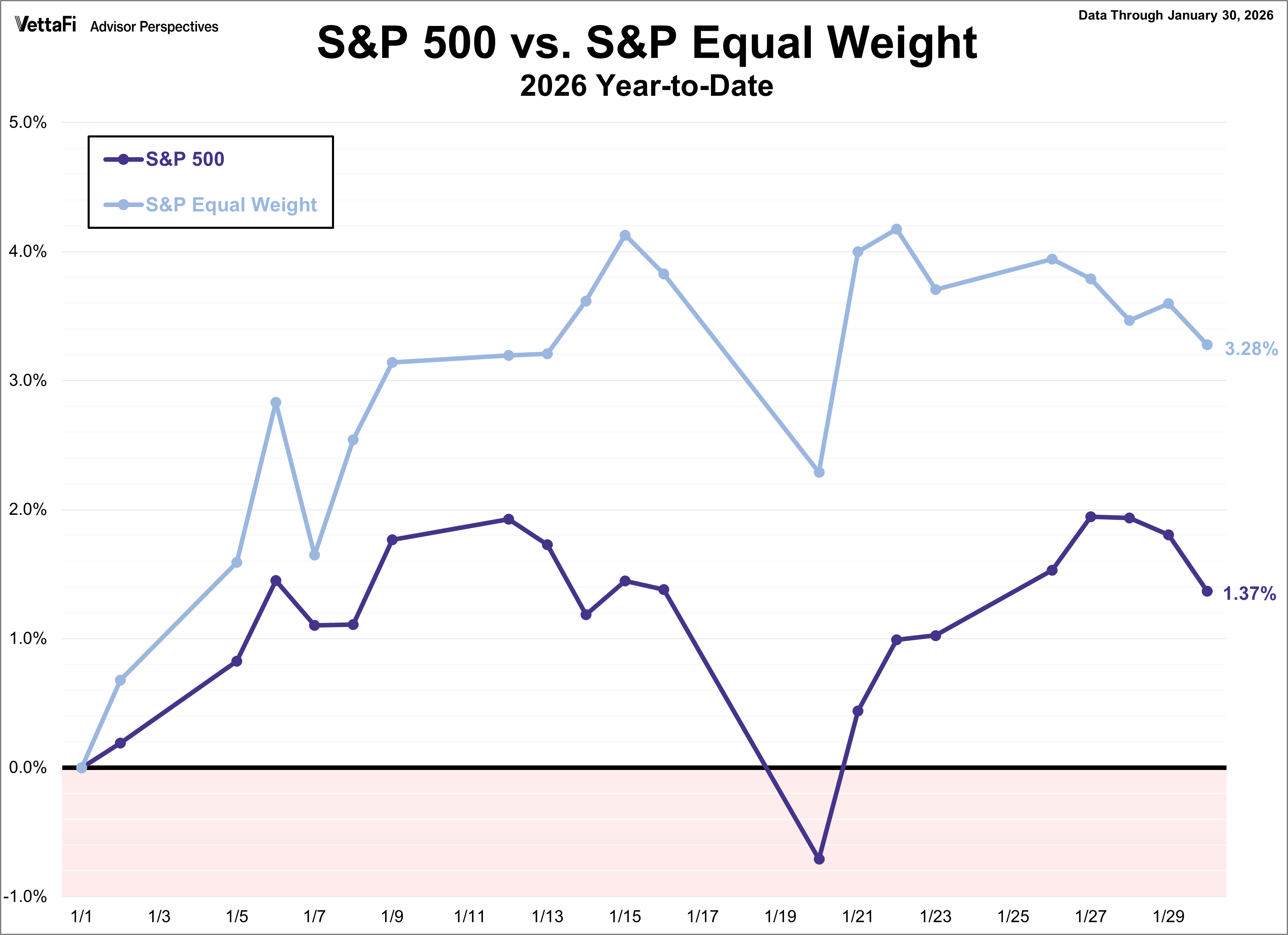 The S&P 500 is currently up 1.37% year to date, while the S&P Equal Weight is up 3.28% year to date.