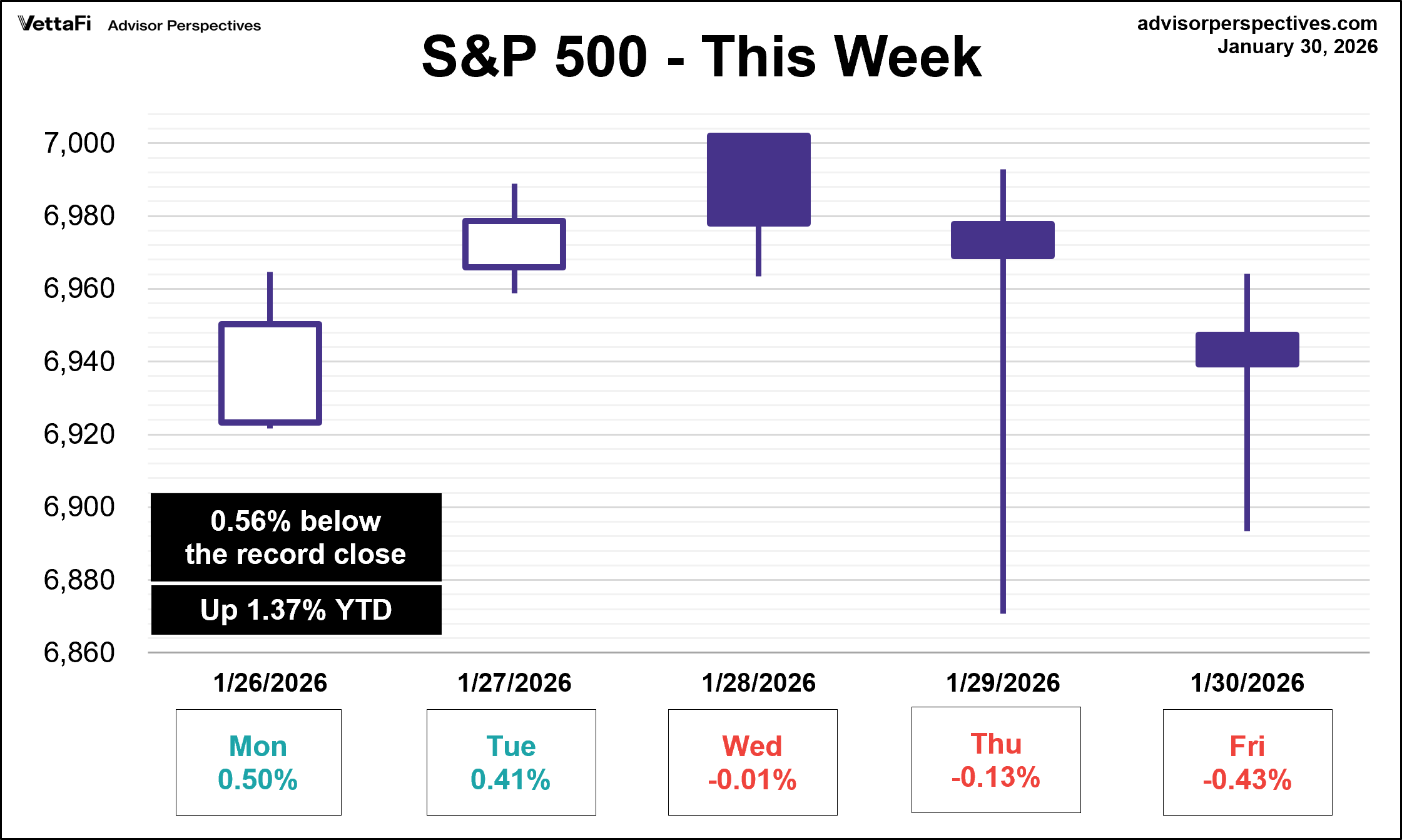 The S&P 500 reached a new record high this week, even momentarily surpassing 7,000 for the first time. Despite these early advances, the index declined through the latter half of the week, wiping out most of its initial gains. Ultimately, the index concluded the week with a modest gain of 0.3%. The index is now 0.56% off its all-time high from January 12, 2026. Here is a snapshot of the index from the past week: