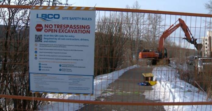 Further to the east, crews are placing a long line of temporary barriers between the buried pipe and the Parkdale community along a 400m stretch of the Bow River pathway.
