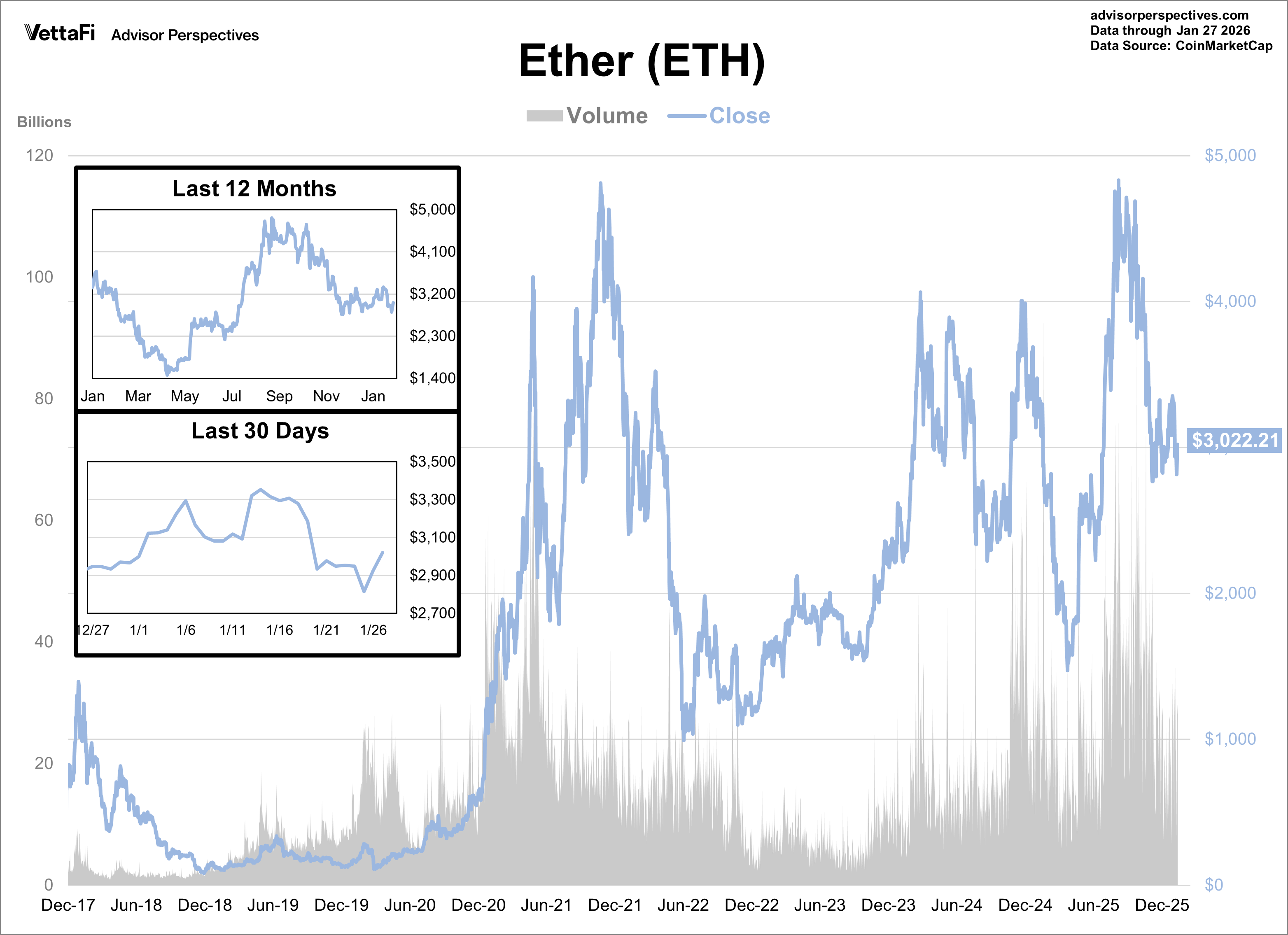 Ether’s closing price reached its lowest level in nearly two months this week but has since crept back above the $3,000 threshold. ETH is currently up ~2% year-to-date and is ~37% below its record close from August 2025.