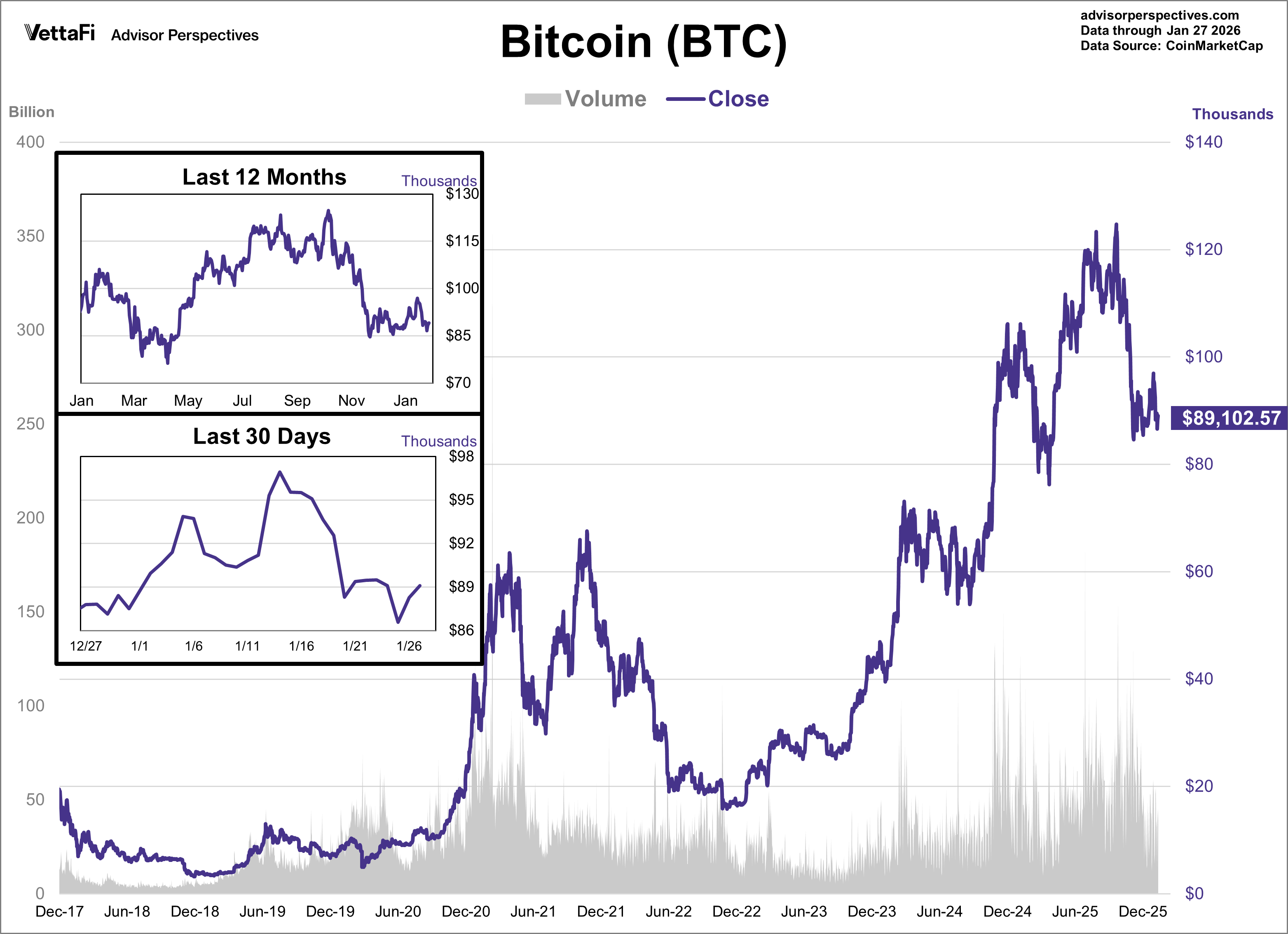 Bitcoin’s closing price dropped its lowest level in over a month this week. BTC is up ~2% year-to-date and is sitting ~28% below its record close from October 2025.
