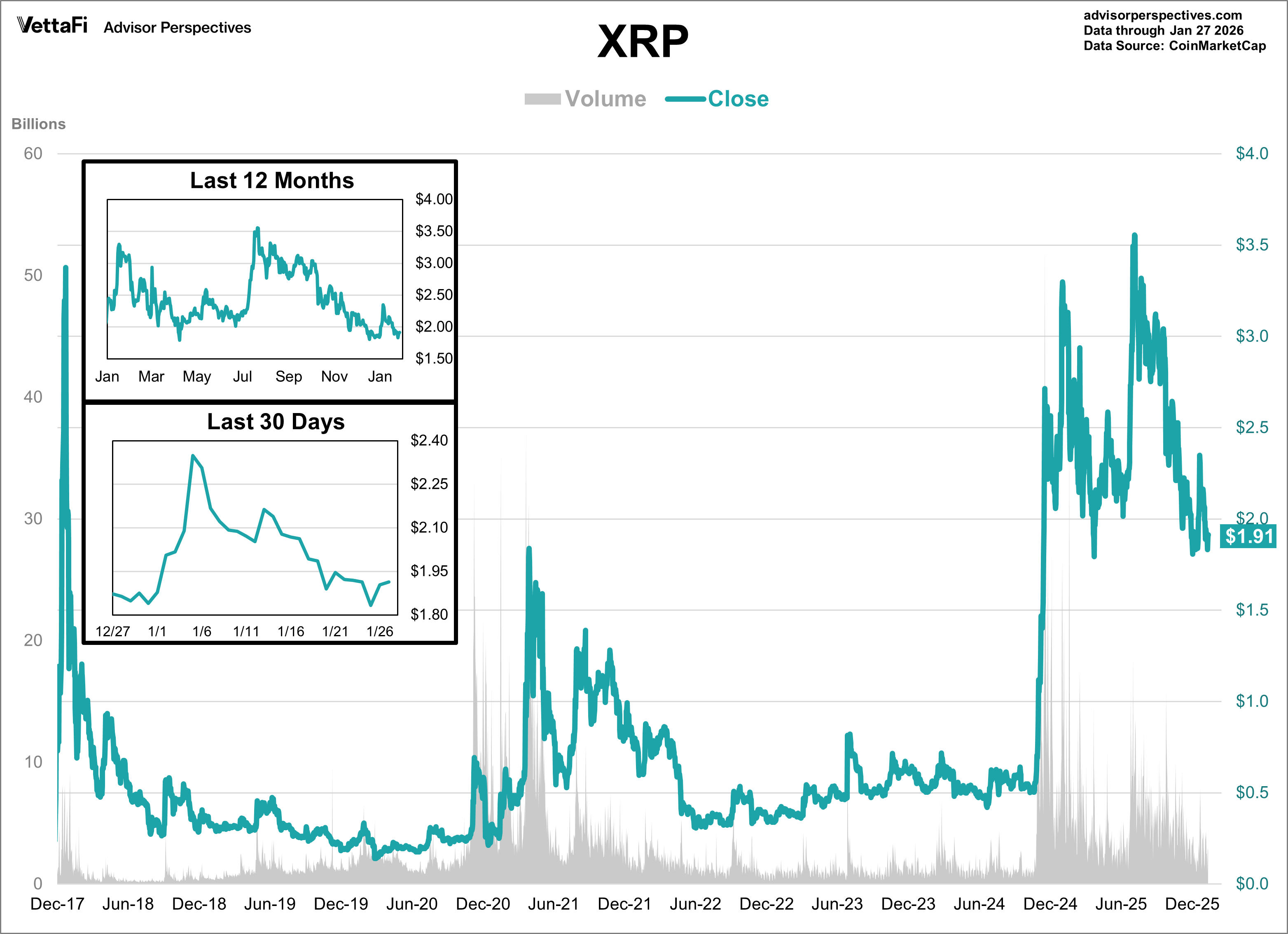 This weekly update tracks some of the largest cryptocurrencies by market share: bitcoin and ether. While both are considered to be high-risk when it comes to investing, the two have foundational differences that investors should know. We’ve also included XRP, as it was one of the largest cryptocurrencies when this series began. According to Wikipedia, a cryptocurrency is “a digital asset designed to work as a medium of exchange that uses cryptography to secure its transactions, to control the creation of additional units, and to verify the transfer of assets.”
