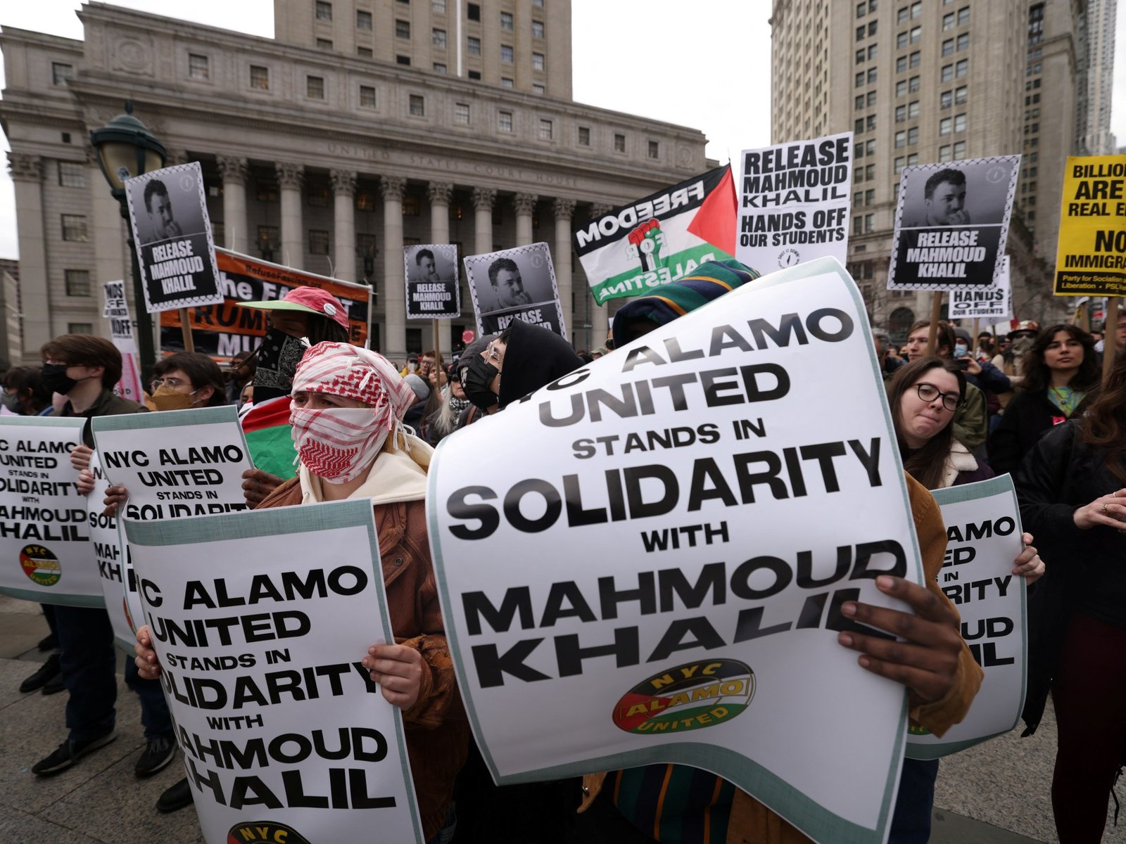 Hundreds of people have rallied outside a New York City courtroom to demand the release of Palestinian activist Mahmoud Khalil, whose arrest over the weekend sparked condemnation and fears of a crackdown on free speech in the United States.