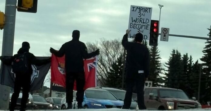 Janet Glockler-Hooke told 880 CHED she was headed to a mall in St. Albert, Alta., on Saturday and when she turned into the parking lot, she noticed three men holding signs and flags that concerned her. Photos of the men show one sign that said “import third world become third world.”