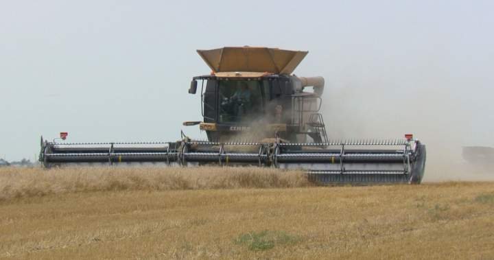 “Two-thirds done wheat,” he told Global News Thursday, adding that amounts to roughly 25 per cent of the total harvest at Herbsigwil Farms in Randolph, Man.