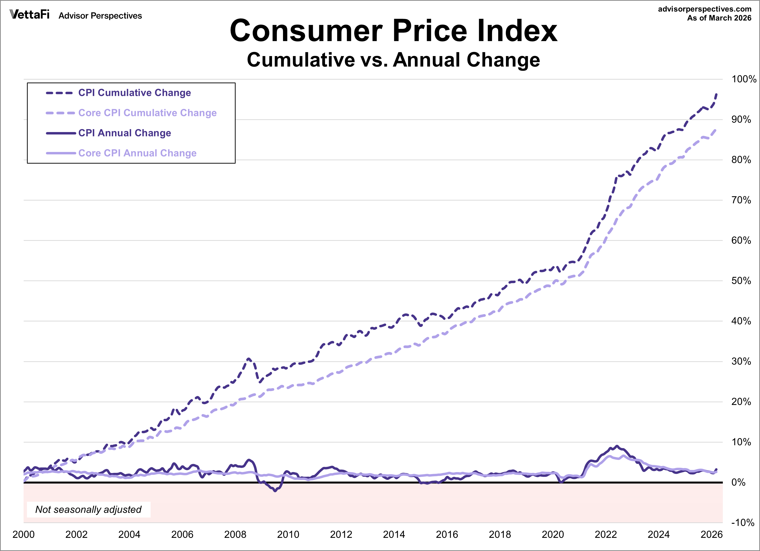 The next chart shows us the annualized rate of change (solid lines) and the cumulative change (dotted lines) in CPI and Core CPI since 2000. As of March 2026, the annualized rate of change for headline CPI is 3.26% while the annualized change for core CPI is 2.60%. However, the cumulative change in these series since 2000 is 96.2% for headline CPI and 87.6% for core CPI.