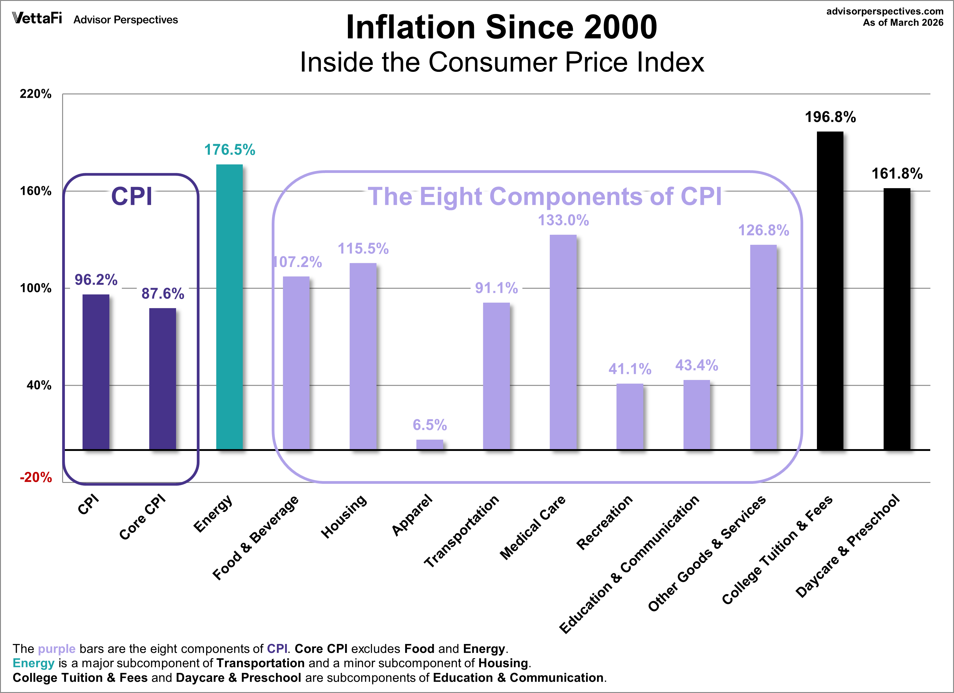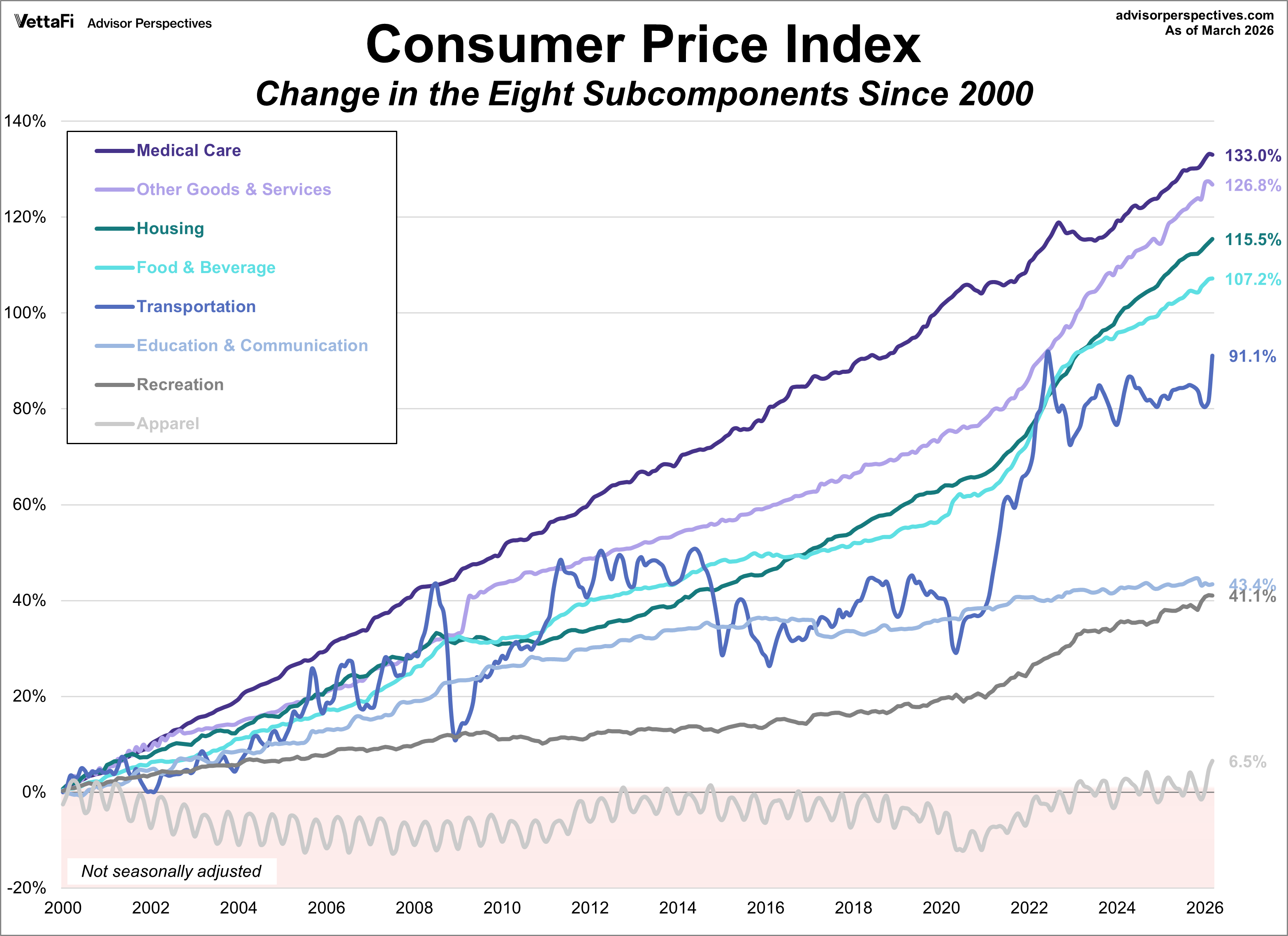 The chart below shows the cumulative percent change in price for each of the eight categories since 2000.