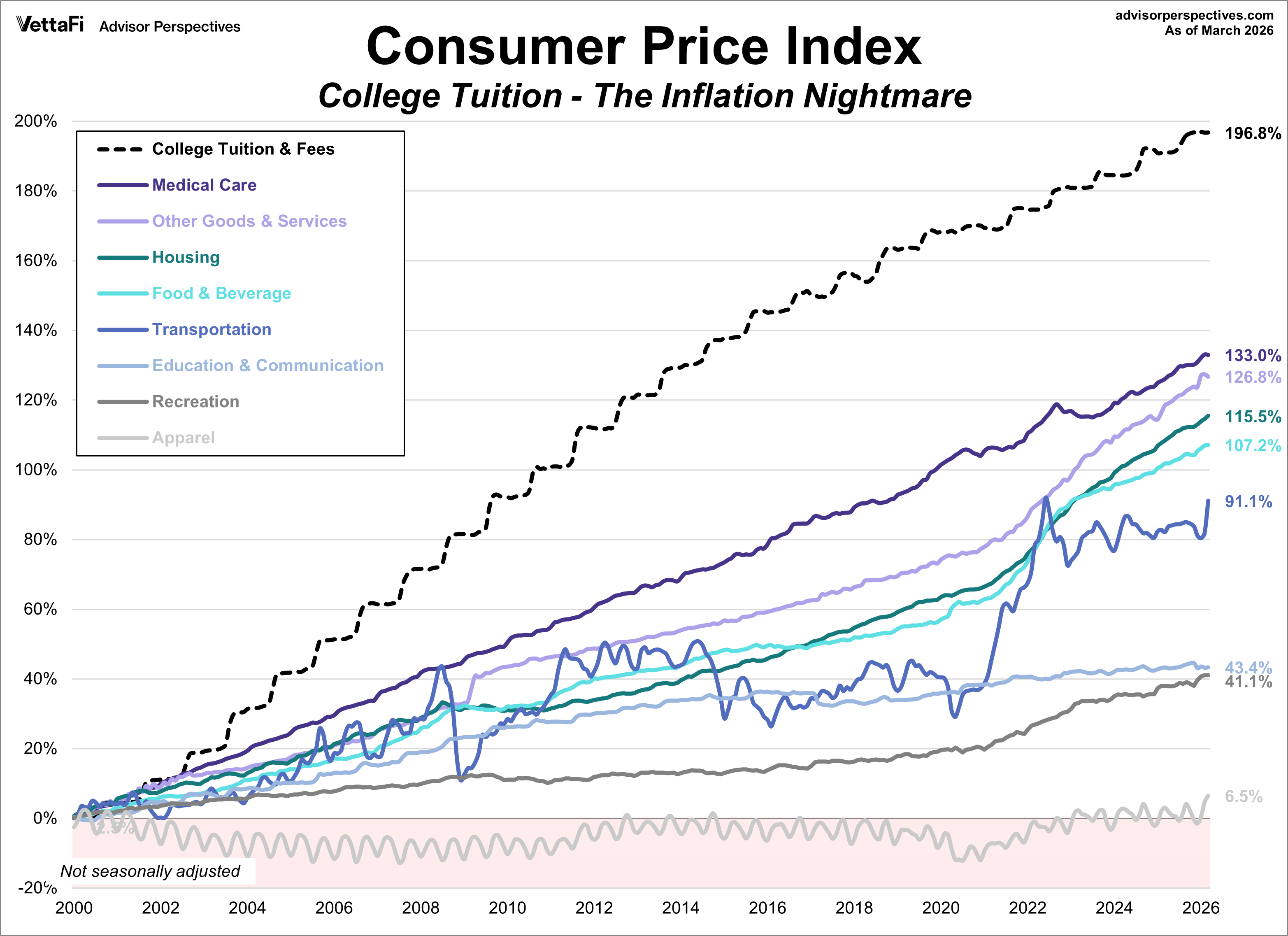 Not surprisingly, Medical Care and Housing have been the fastest-growing categories, each growing more than 100% since the turn of the century. The Food and Beverage category is the other category up over 100%, in large part due to the steep spike in prices following the pandemic. At the opposite end is Apparel, which is nearly unchanged since 2000 but has even deflated at times. Another unique feature of Apparel is the obvious seasonal volatility of the contour line.
