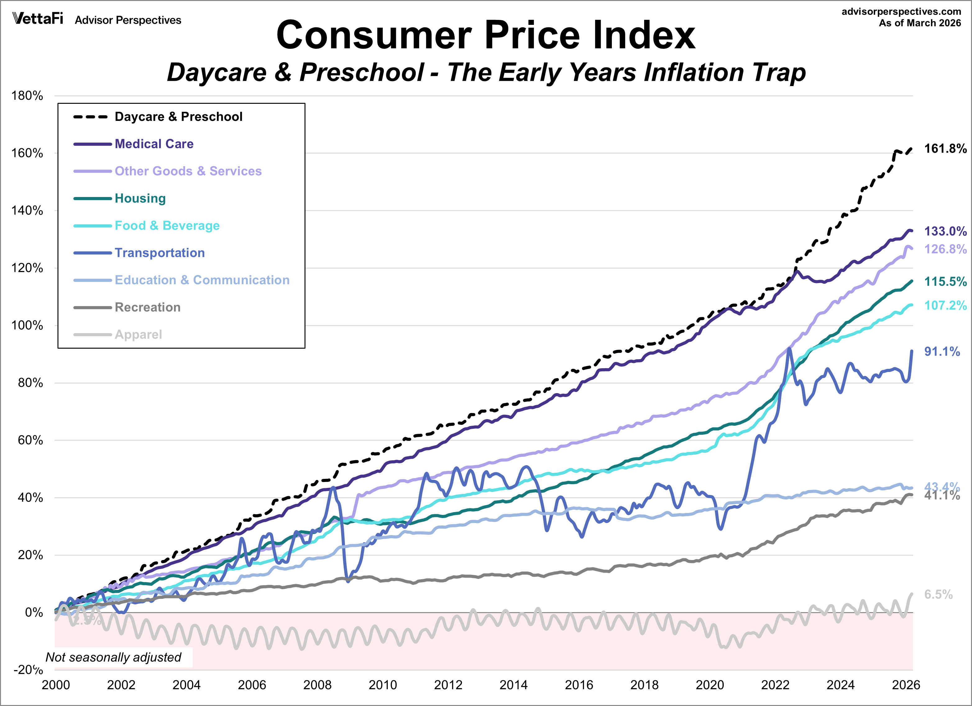The financial burden of early childhood care has become an increasingly daunting hurdle for families. The BLS weights Daycare and Preschool at just 0.699% of total expenditures, meaning its impact if often diluted in headline inflation reports. However, for households with young children, these costs represent a primary and non-negotiable expense that can rival or even exceed monthly housing payments. For the first two decades of the century, daycare costs tracked closely with the high inflation seen in Medical Care, though consistently above. This changed near the end of 2022 when daycare costs began to surge at an accelerated rate compared to their previous trajectory, likely due to the expiration of pandemic-era stabilization grants and a tightening labor market. Now up over 160% since 2000, this category has transformed from a steady climb into a steep ascent, placing an unprecedented strain on the modern family budget.