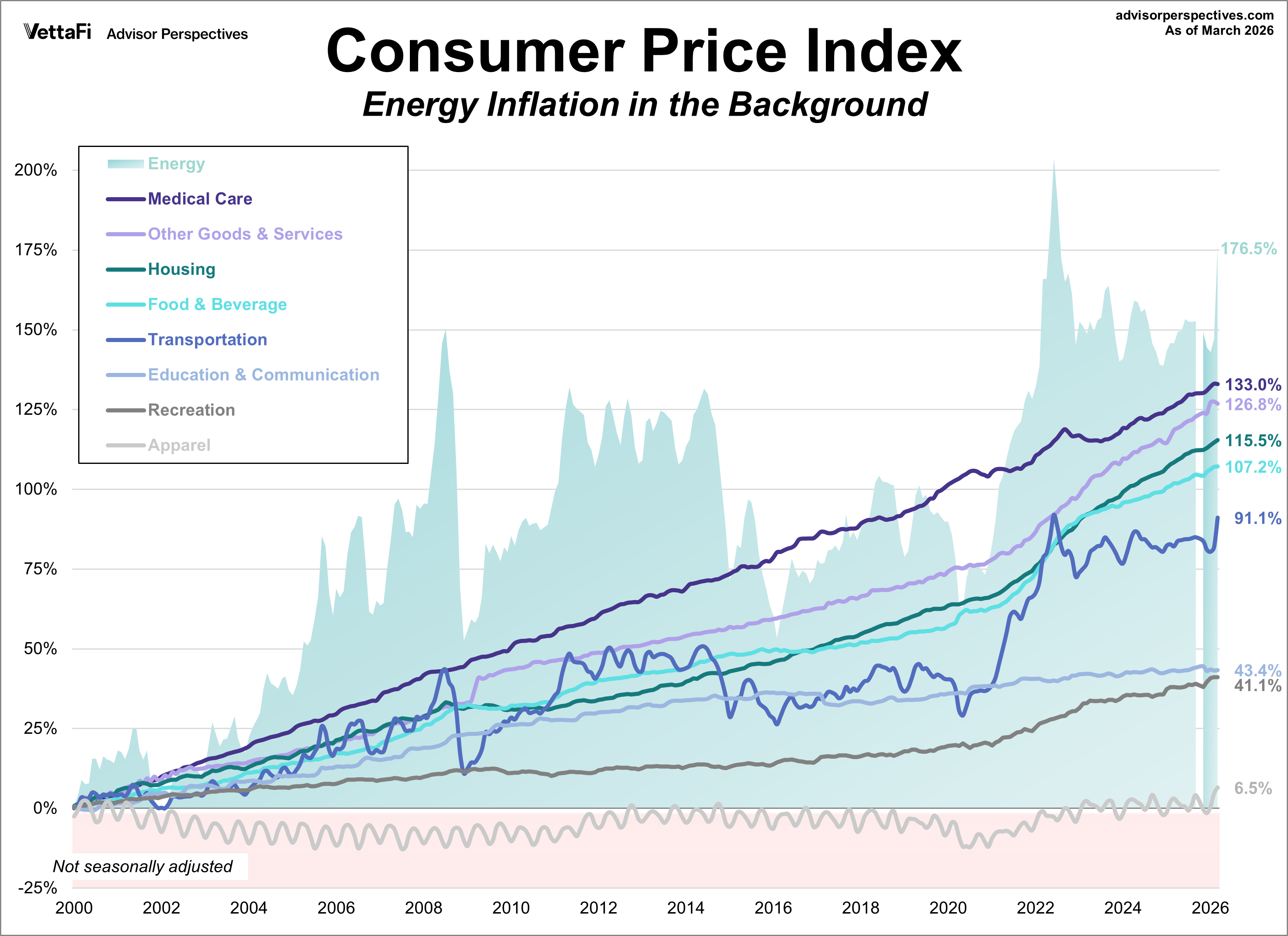 The BLS does track Energy as a separate aggregate index, comprised of household energy under the “fuels and utilities” index (Housing category) and the motor fuels index (Transportation category). As of the latest weighing (December 2025), Energy has been assigned a relative importance of 6.297 out of 100. In other words, Uncle Sam calculates inflation on the assumption that energy in one form or another constitutes 6.3% of total expenditures, 2.9% goes to transportation fuels — mostly gasoline, and 3.4% goes to household energy — mostly electricity. The next chart overlays the highly volatile Energy aggregate on top of the eight expenditure categories. We can immediately see the impact of energy costs on transportation.