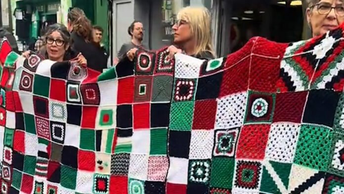 Video shows a blanket knitted by Irish activists as a tribute to children killed in Gaza. Each square of the blanket rep
