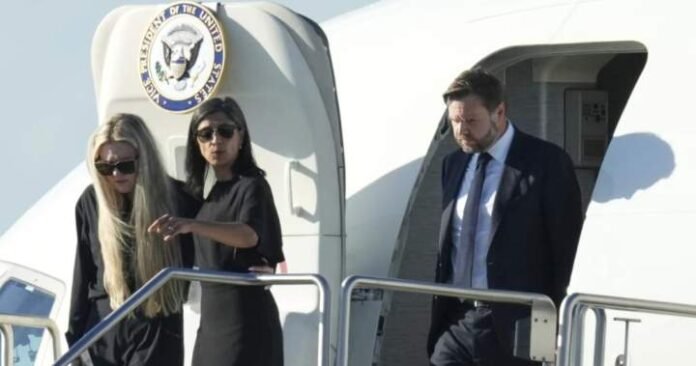 Vance’s wife, Usha, stepped off the plane with Kirk’s widow, Erika — both women wearing black outfits and sunglasses.