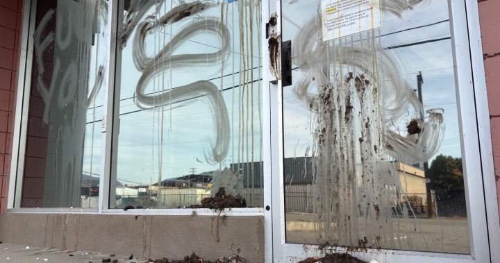 Video from Kelowna Now and shared with Global News shows fecal matter spread across the front windows and doors.