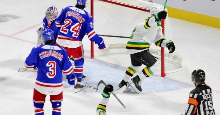 Kaeden Hawkins’ second goal in as many games gave London their first lead at 6:26 of the third period as he deflected a Julian Brown slap shot into the Ranger net, and it was 2-1 for the Knights.