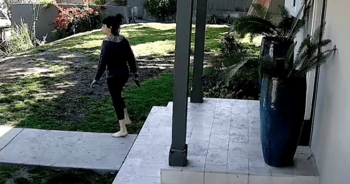 In a separate segment of silent surveillance video from Lauren’s backyard, Lauren can be seen exiting the home barefoot and carrying a pistol in her right hand. Another segment shows Lauren from behind, apparently raising a gun that is briefly visible. Dirt kicks up near Lauren’s feet, and she turns and walks toward a doorway to the house.