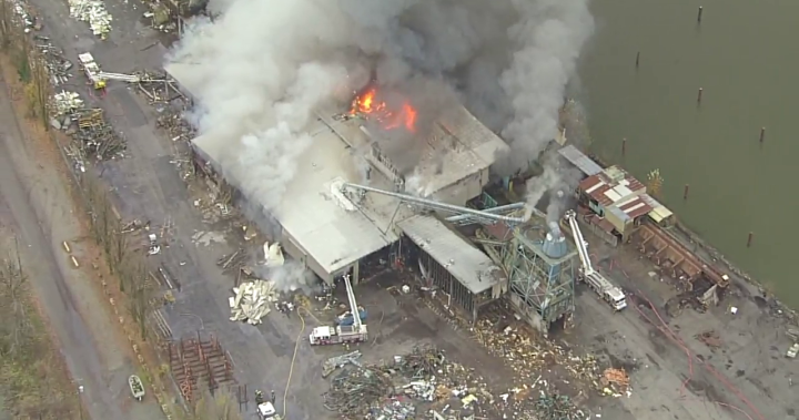 The fire appears to be at a sawmill north of the Alex Fraser Bridge on Alaska Way. Smoke can be seen across the region and fire trucks and ambulances are on the scene.