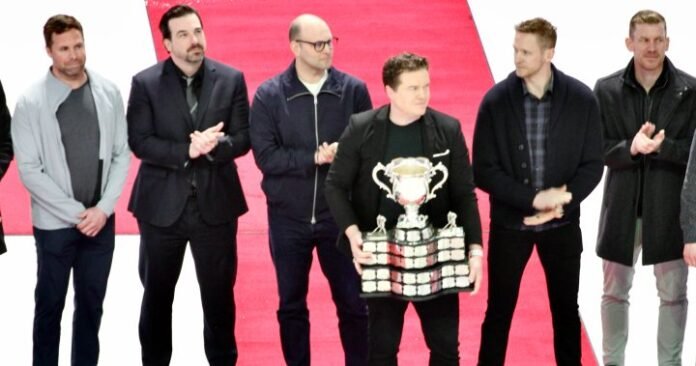 With the 2005 Memorial Cup Championship team looking on, the London Knights clinched the Hamilton Spectator Trophy and first overall in the Ontario Hockey League for the second straight season.