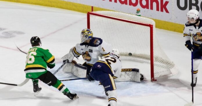 Barkey started a play in his own zone and then finished it at the other end of the ice to make it 2-1 London at the 14:32 mark as he started a break out and then eventually took a feed from behind the net from Nicholl and scored.