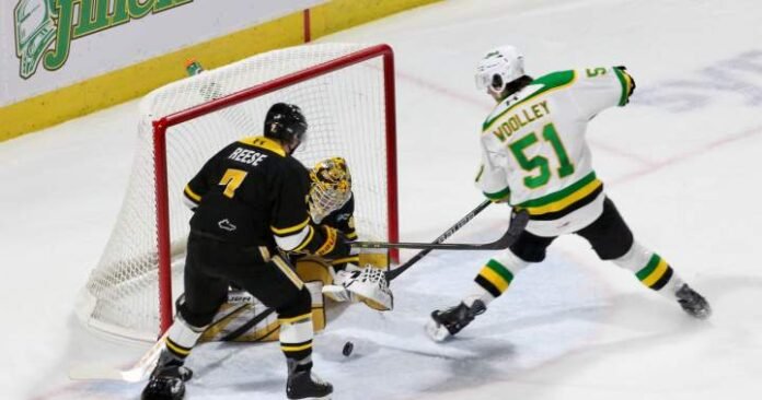 Brenner Lammens gave the Sting their first lead of the game on another odd bounce as his dump-in from just outside the London blue line that hit the ice just outside the Knights crease and boinged its way in at the 11:17 mark of period two.