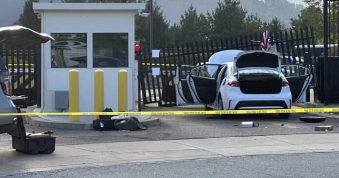 The car crashed into the gate at about 2:40 a.m., the FBI said, and authorities were searching for the man, identified as Donald Henson of Penn Hills, Pa. Investigators, including a bomb squad, were at the scene.