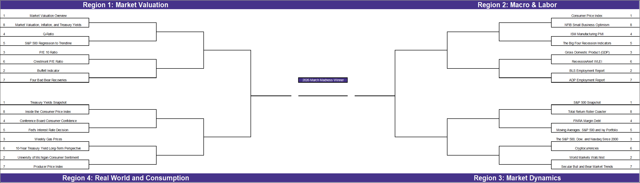 In Region 2, we saw several upsets. While inflation (CPI) has dominated headlines, the #5 seed Big Four Recession Indicators captured more sustained engagement, suggesting that recession fears outweigh price concerns.