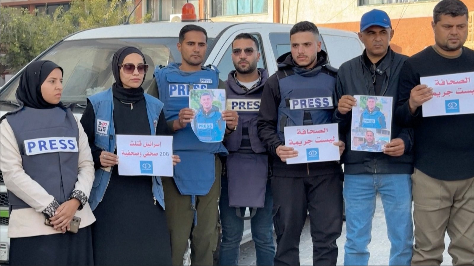 Palestinian journalists rallied in front of Nasser Hospital in Gaza’s Khan Younis to protest the targeting of their colleagues Mohammad Mansour and Al Jazeera journalist Hossam Shabat, killed in Israeli strikes two days ago.