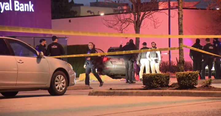 A large area of the parking lot of the Scott Road Crossing shopping plaza parking lot near Scott Road and 80 Avenue was cordoned off with police tape.
