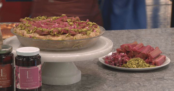 Once the tart is cooled, put the poached rhubarb on the tart in a pretty pattern.