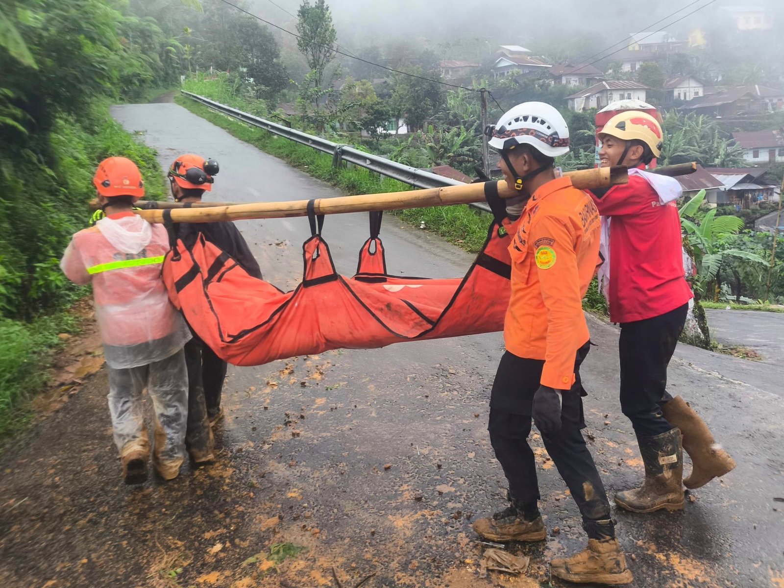 Rescuers were forced to walk about four kilometres (2.5 miles) to get to the site because the road was inaccessible. An excavator had been deployed to clear the mudslide while heavy rain and fog hindered rescue efforts.