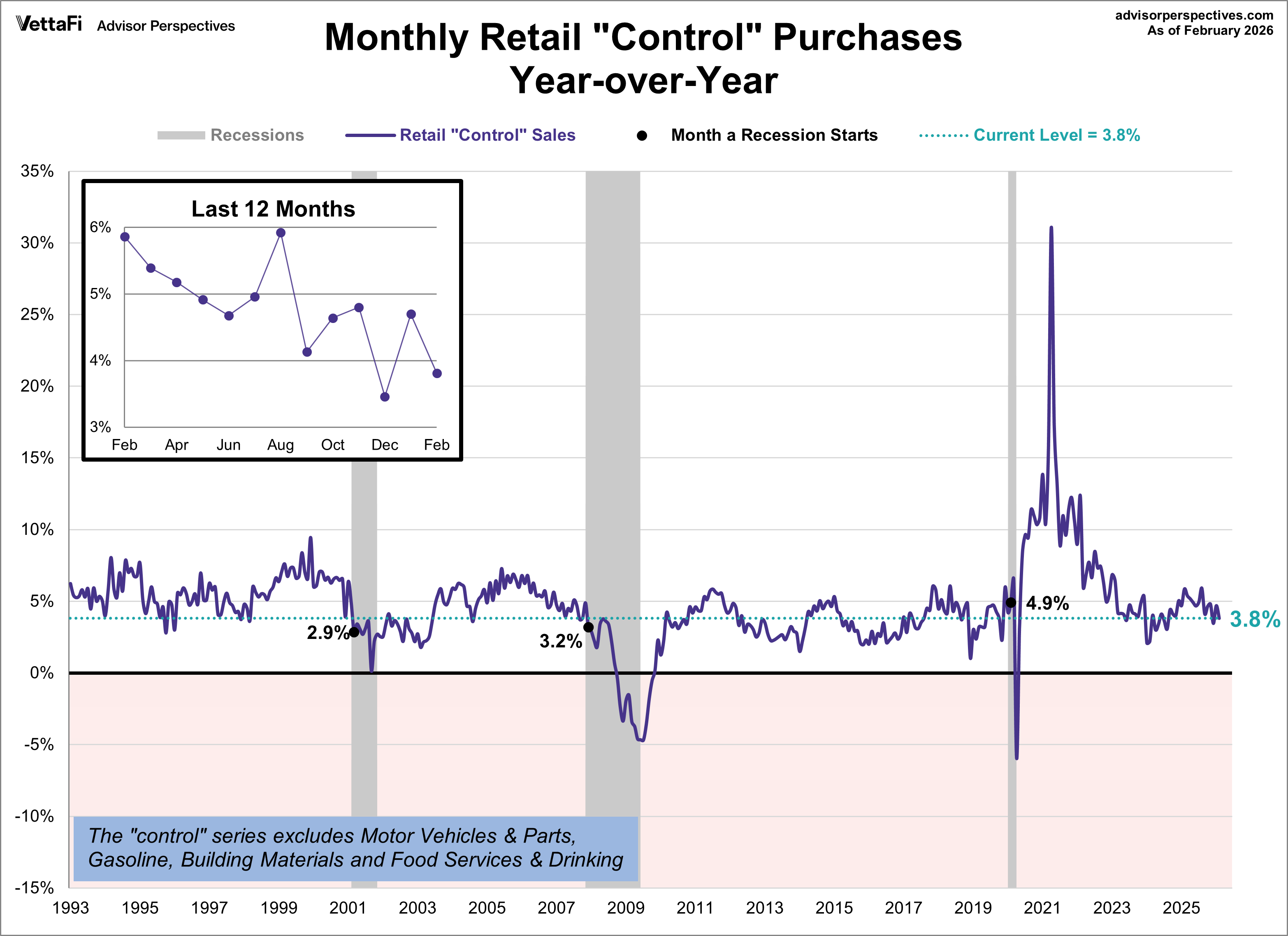 For a better sense of the reduced volatility of the “control” series, here is a YoY overlay with the headline retail sales. Note that the two series follow each other closely, but headline sales have more extreme highs and lows than the control series.