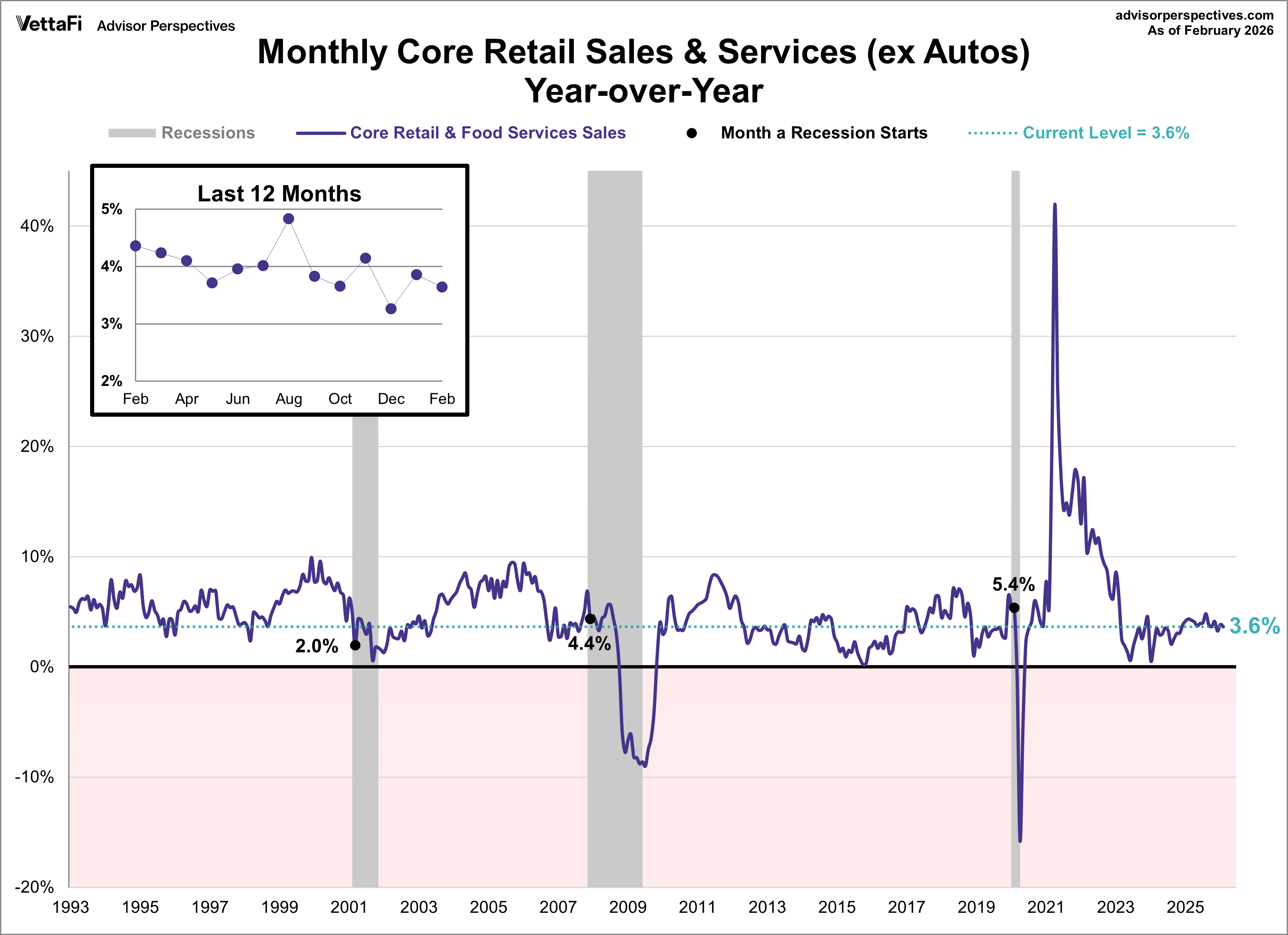 Core retail sales are up 3.6% compared to one year ago. Here is the year-over-year chart of core retail sales with a callout to the most recent 12 months.