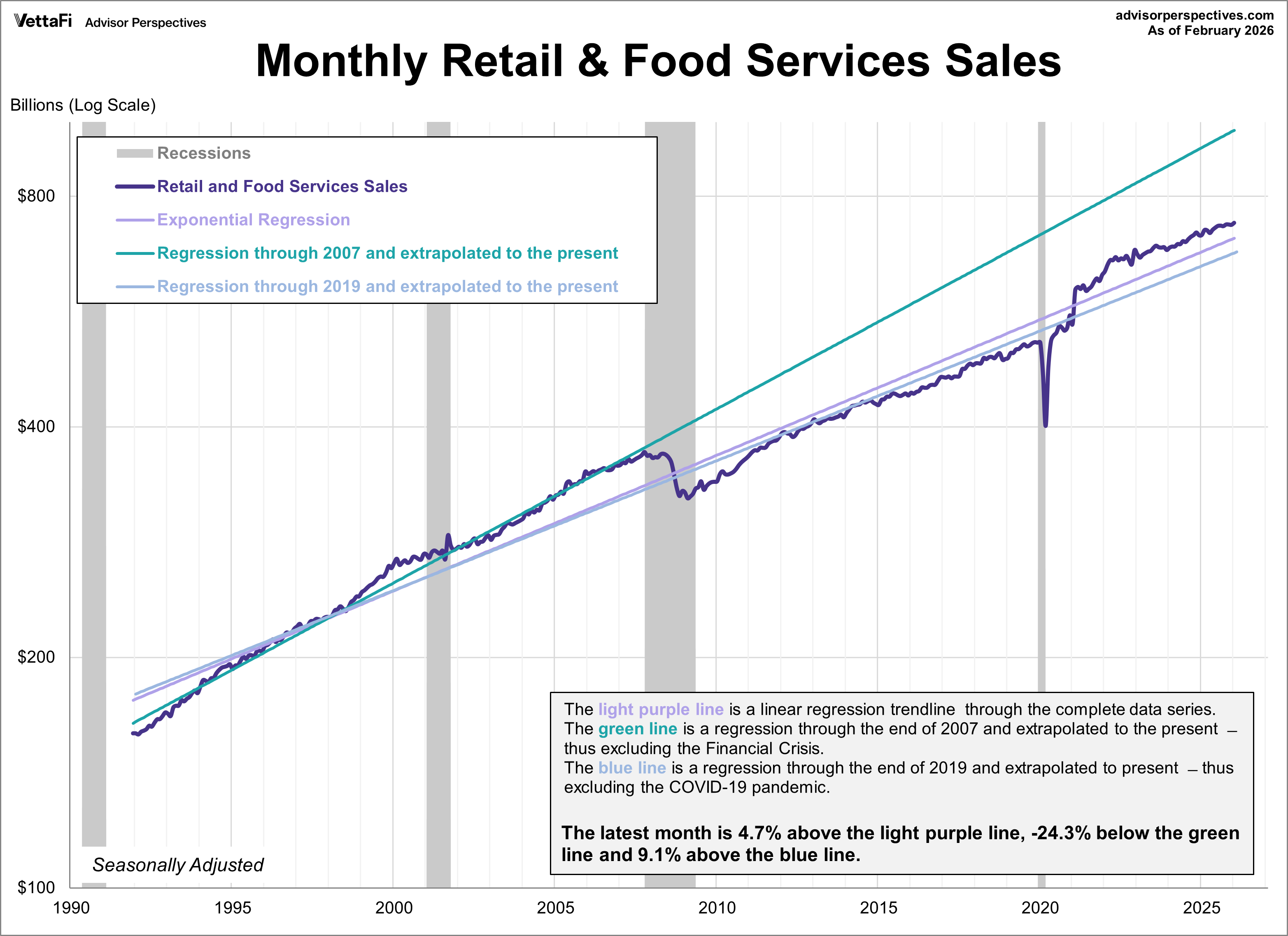 The chart below is a log-scale snapshot of retail sales since the early 1990s. The three exponential regressions through the data help us to evaluate the long-term trend of this key economic indicator.
