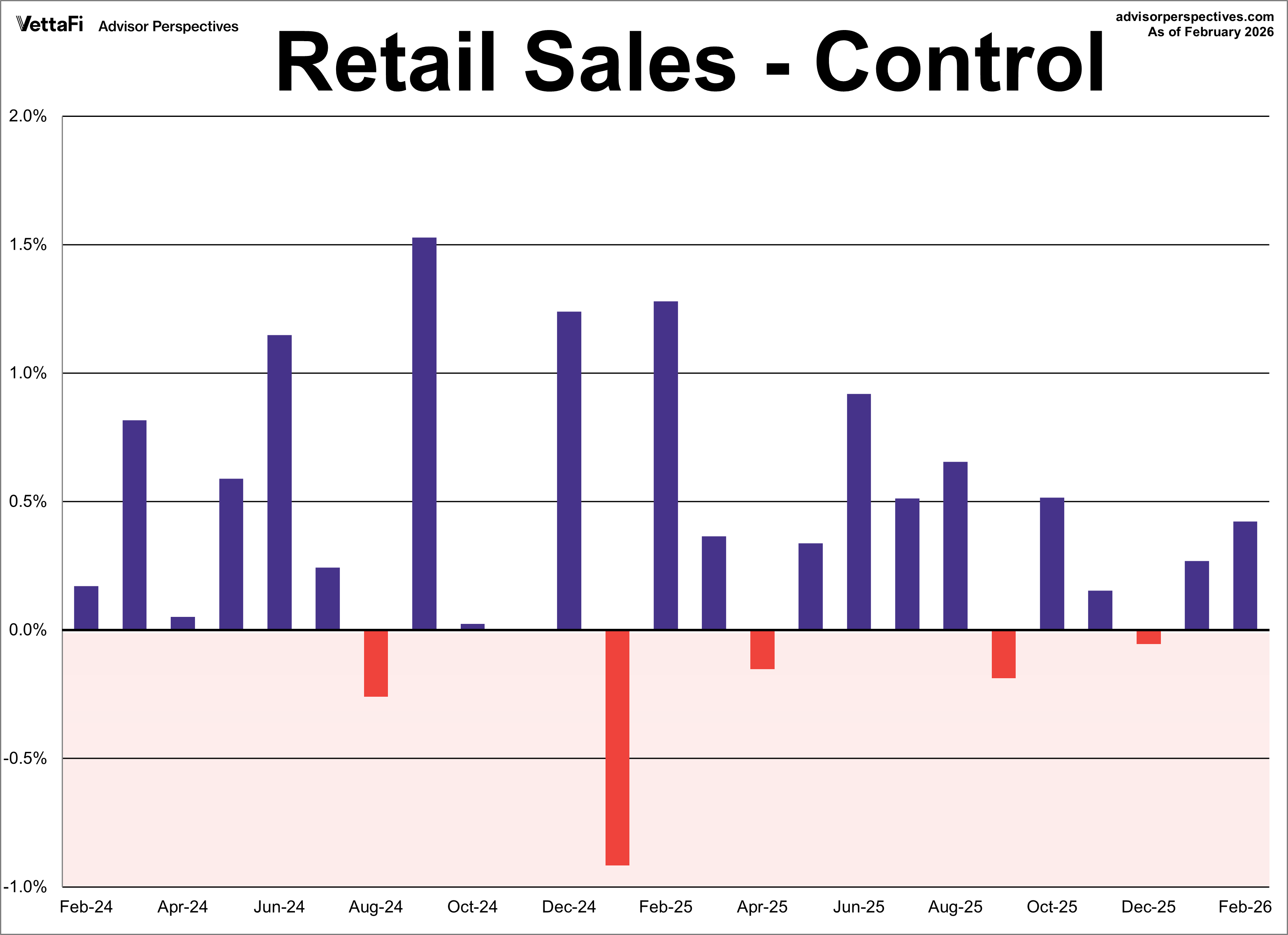 The next two charts illustrate retail sales “control” purchases, which is an even more “core” view of retail sales. This series excludes motor vehicles & parts, gasoline, building materials as well as food services & drinking places. The popular financial press typically ignores this series, but it’s a more consistent and reliable reading of the economy. Retail sales control purchases rose 0.5% in February. This is up from January’s 0.2% reading and was higher than the expected 0.3% growth in control sales.