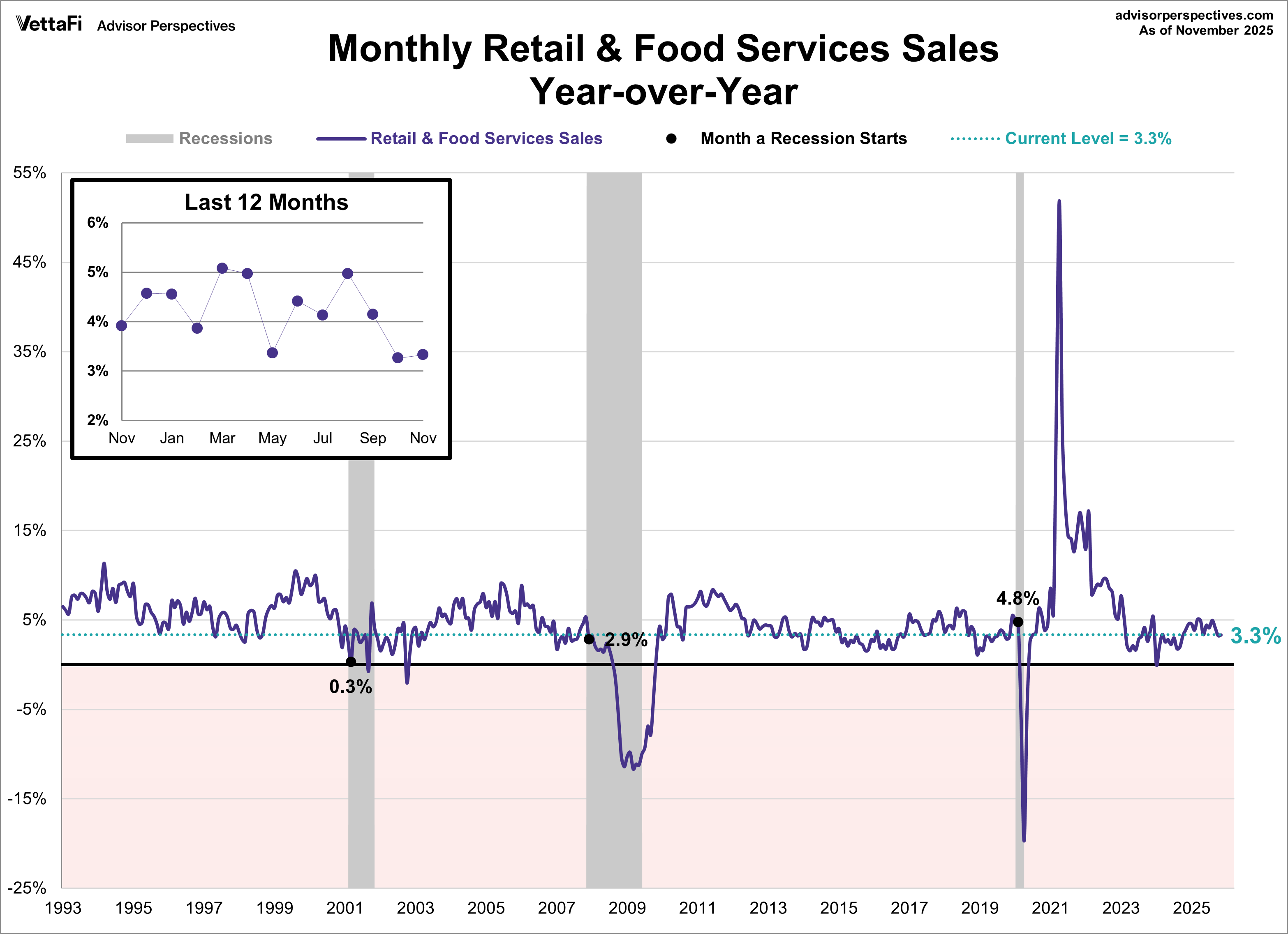 The year-over-year percent change provides another perspective on the historical trend. Current retail sales are up 3.3% compared to one year ago. Here is the headline series with a callout to the most recent 12 months.