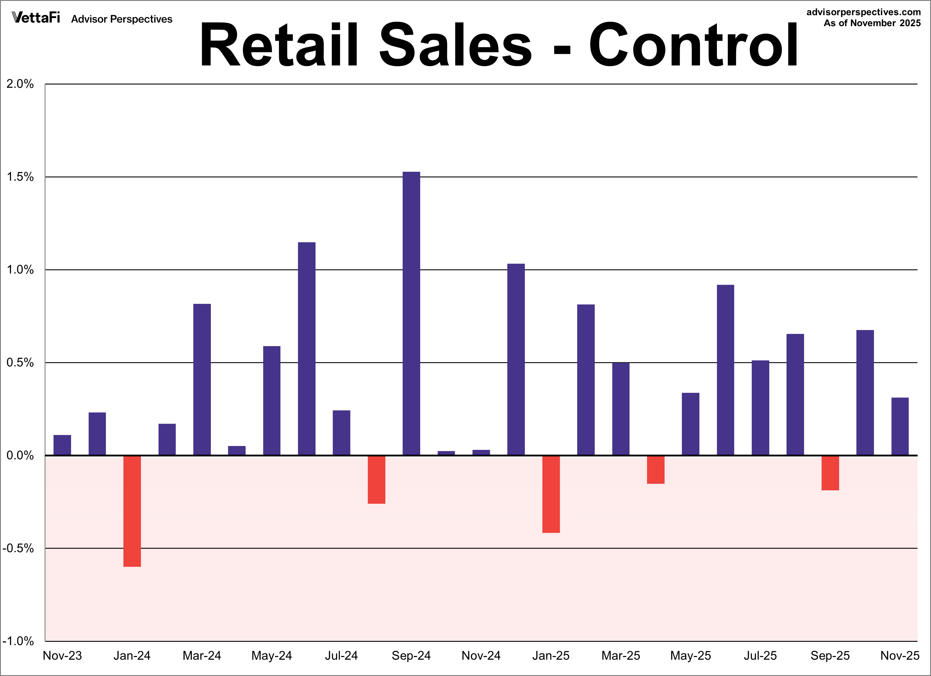 The next two charts illustrate retail sales “control” purchases, which is an even more “core” view of retail sales. This series excludes motor vehicles & parts, gasoline, building materials as well as food services & drinking places. The popular financial press typically ignores this series, but it’s a more consistent and reliable reading of the economy. Retail sales control purchases rose 0.3% in November. This is down from October’s 0.7% reading and was lower than the expected 0.4% growth in control sales.