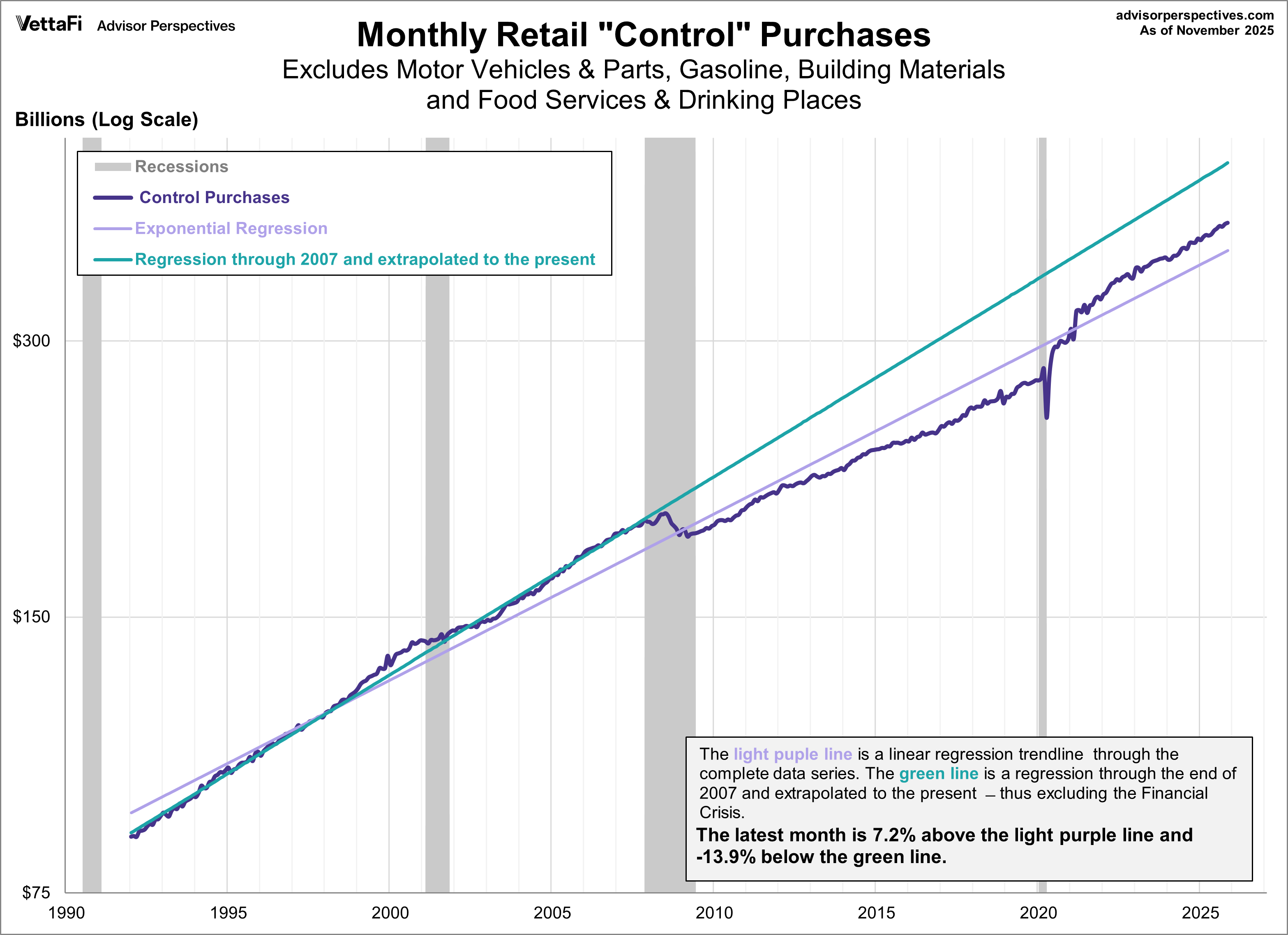Similar to the retail sales snapshot chart earlier, the chart below is a log-scale snapshot of control purchases since the early 1990s and includes two of the exponential regressions previously mentioned.