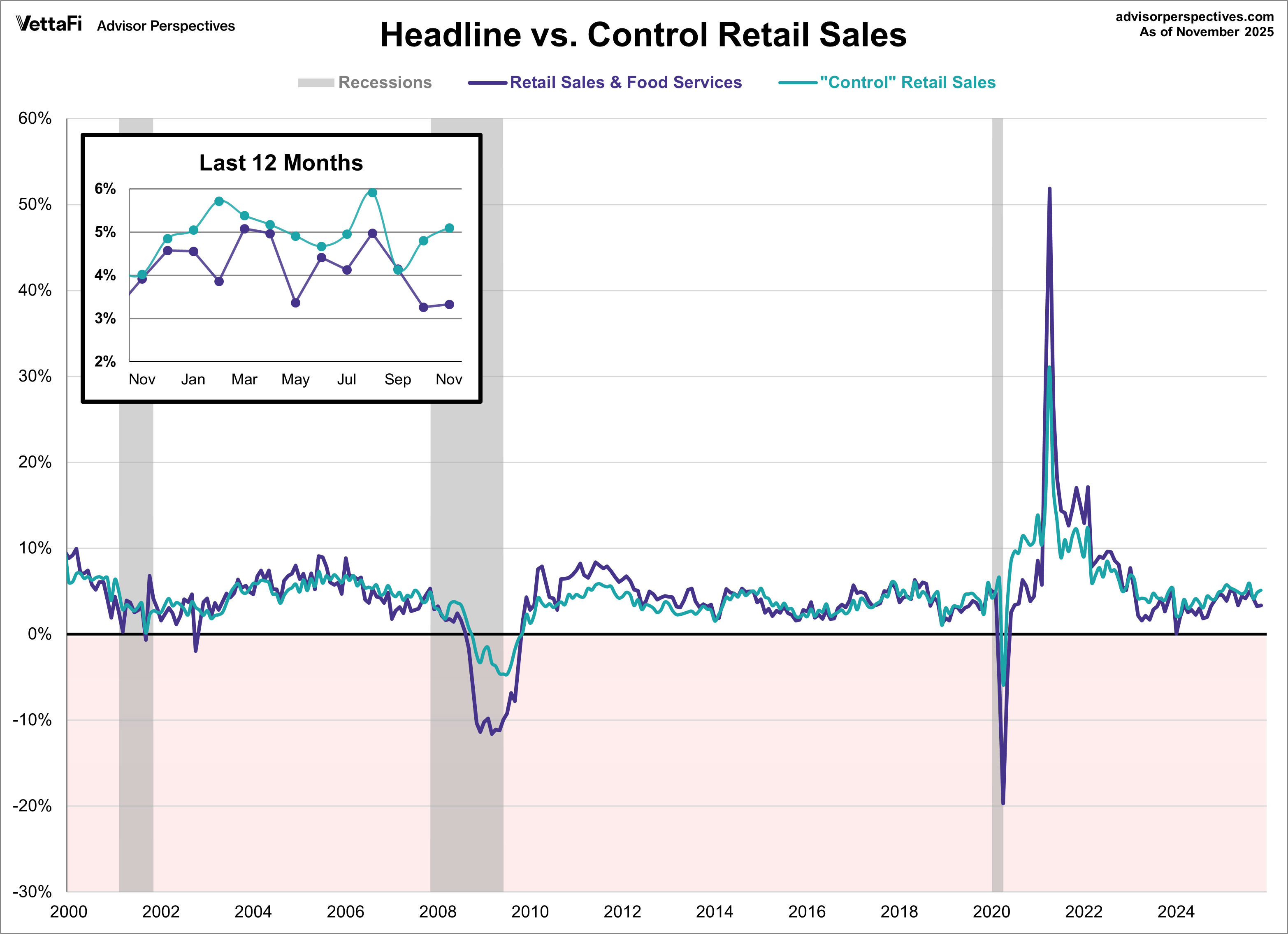 For a better sense of the reduced volatility of the “control” series, here is a YoY overlay with the headline retail sales. Note that the two series follow each other closely, but headline sales have more extreme highs and lows than the control series.