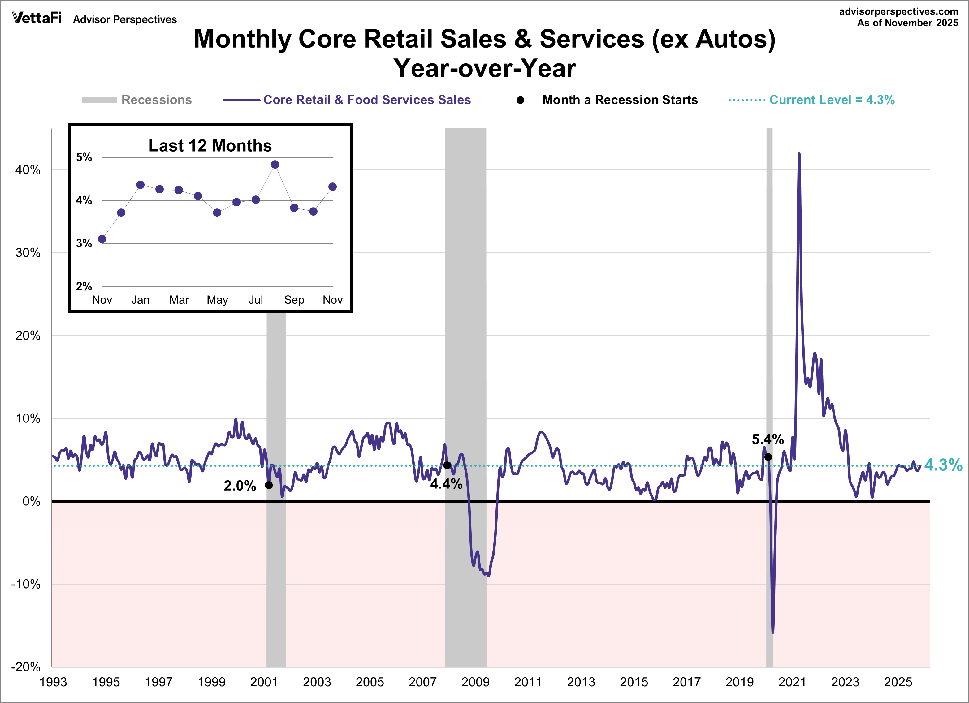Core retail sales are up 4.3% compared to one year ago. Here is the year-over-year chart of core retail sales with a callout to the most recent 12 months.