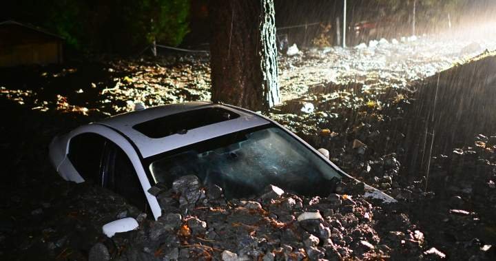 San Bernardino County firefighters said they rescued people trapped in cars when mud and debris rushed down a road leading into Wrightwood, a resort town in the San Gabriel Mountains about 130 kilometres northeast of Los Angeles. It was not immediately clear how many people were rescued.