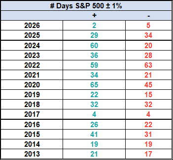 Here are a few tables with the number of days of a 1% or greater change in either direction and the number of days of corrections (down 10% or more from the record high).