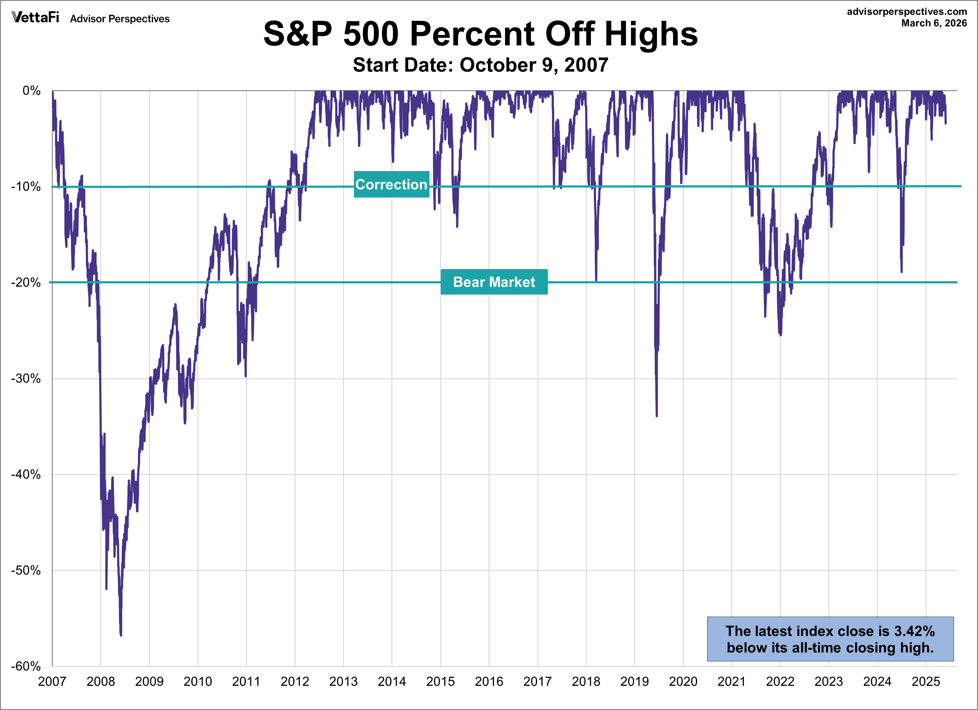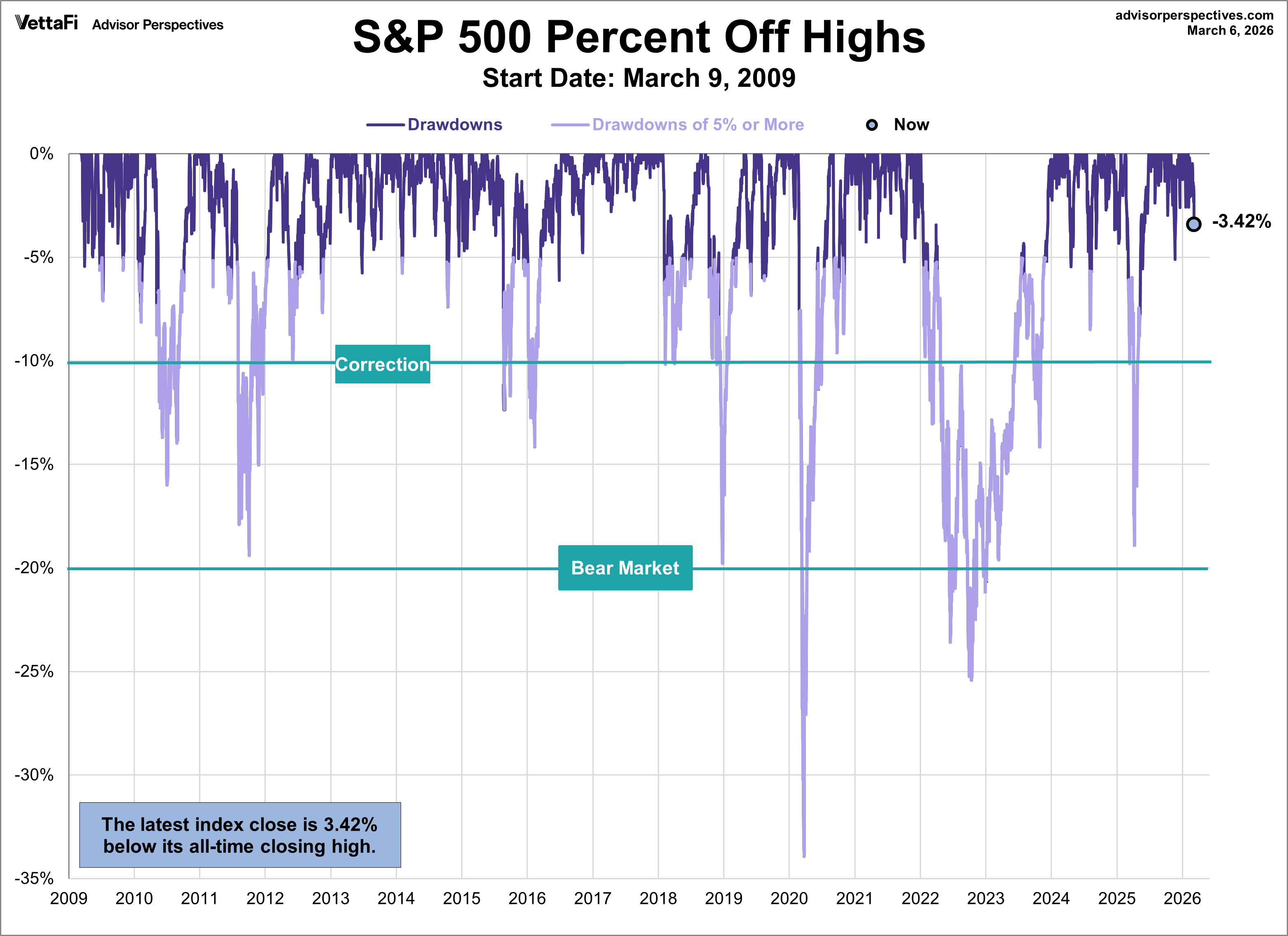 What happens if we take out the Global Financial Crisis? Here’s a snapshot the same chart above where the start date has been changed to the trough reached on March 9, 2009. Note the recent selloffs in 2022.