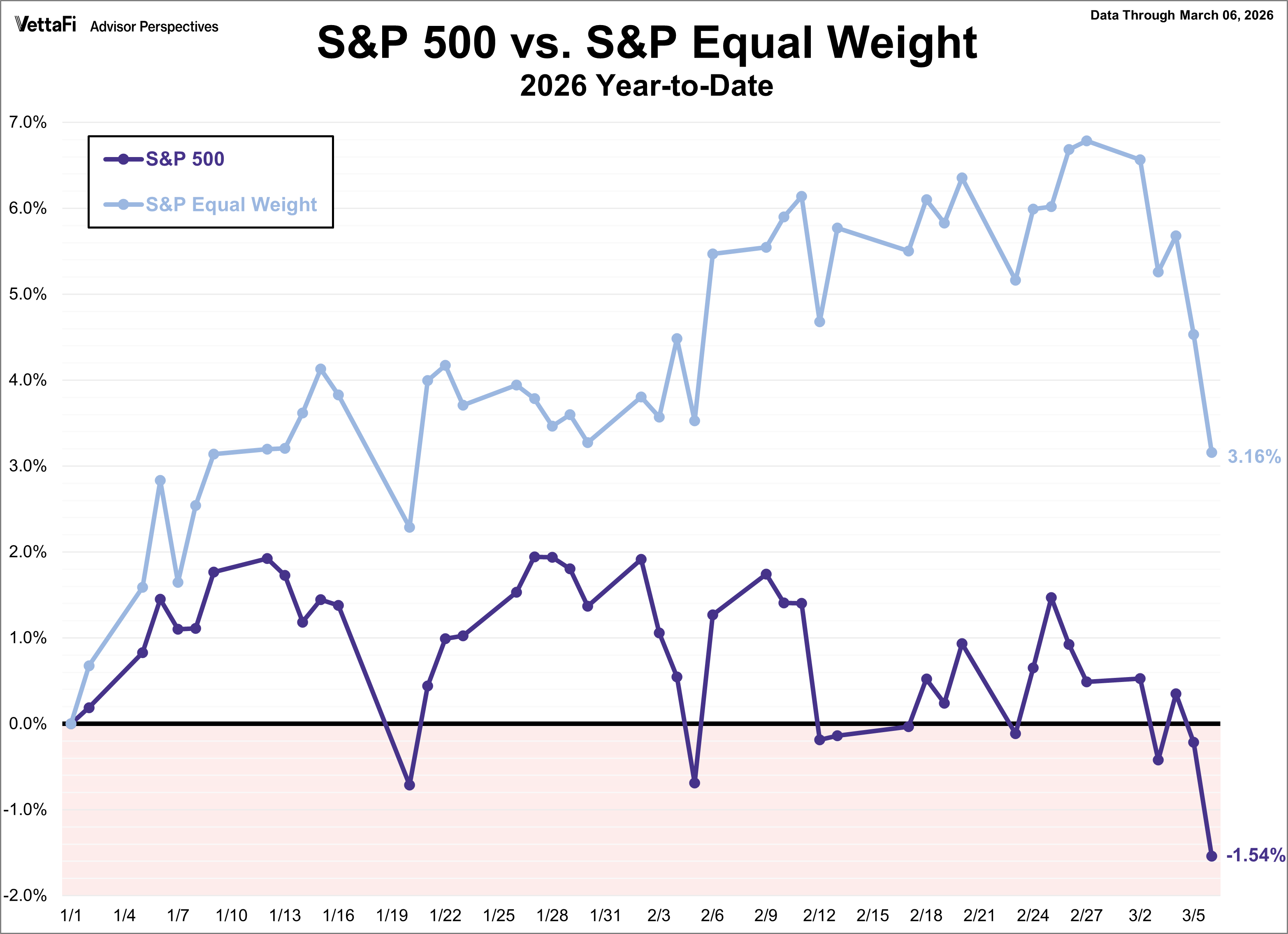 The S&P 500 is currently down 1.54% year to date, while the S&P Equal Weight is up 3.16% year to date.