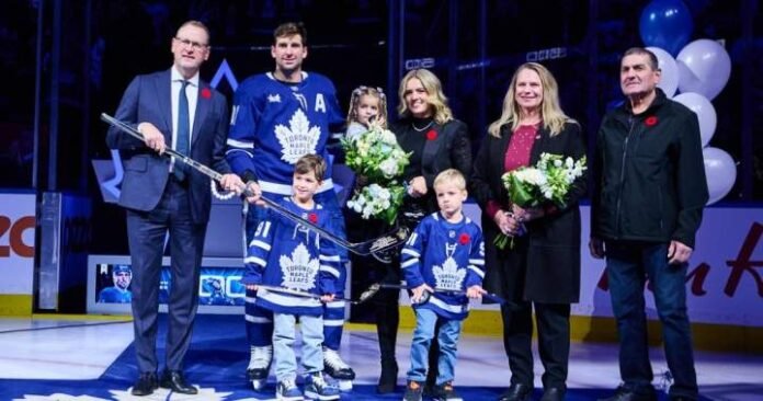 TORONTO – John Tavares was joined on the ice before Wednesday’s opening faceoff by his family to mark an impressive milestone.
