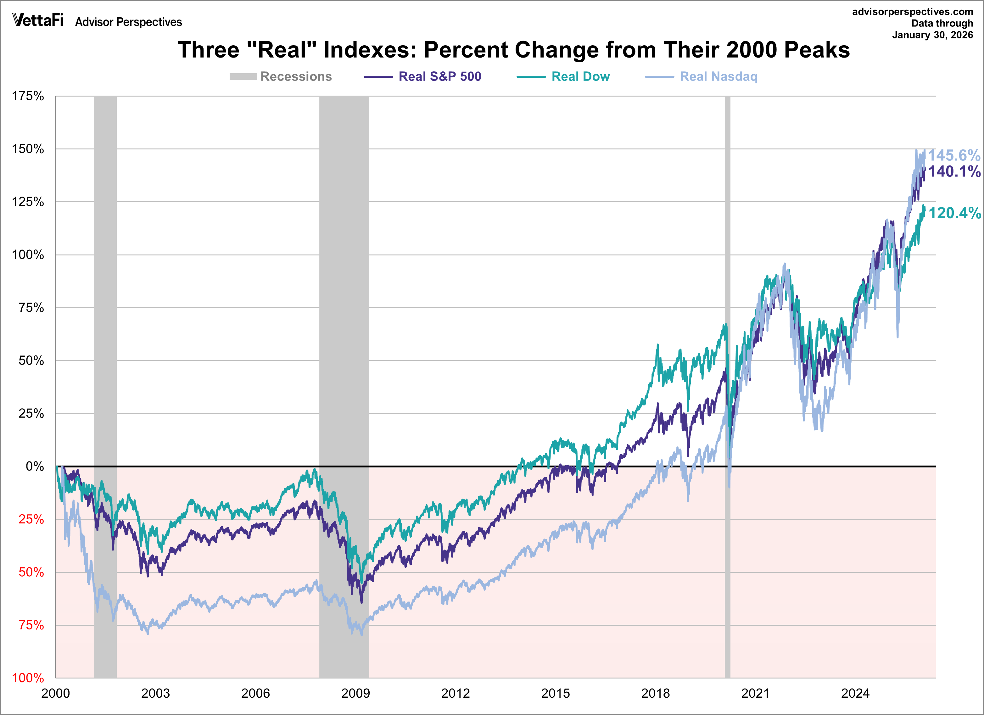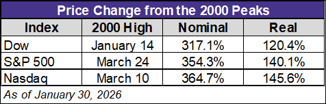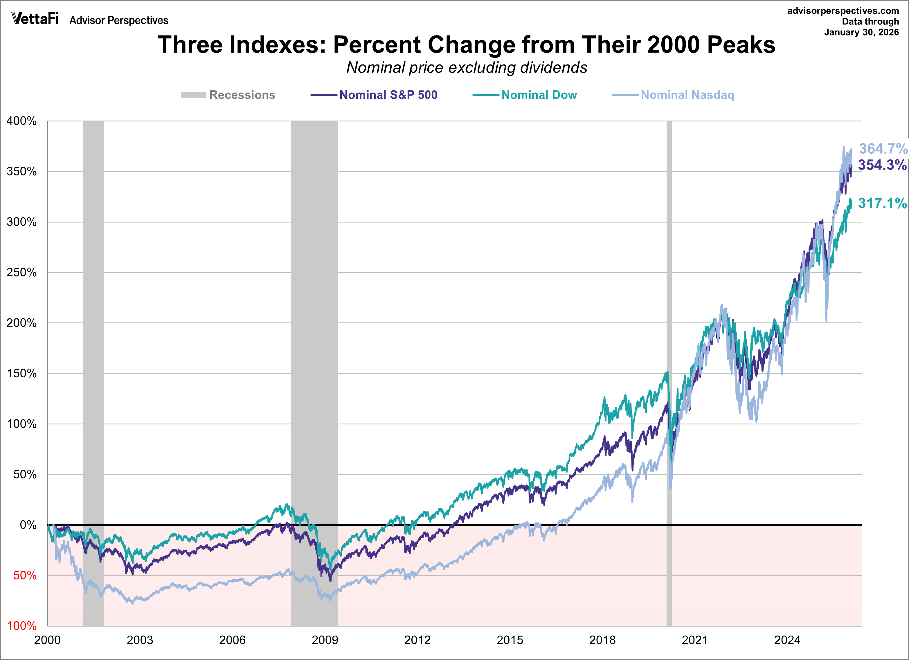 In this article, we examine these three indices and how they have changed since their peaks from 2000. We’ve updated the data through the January 2026 close.