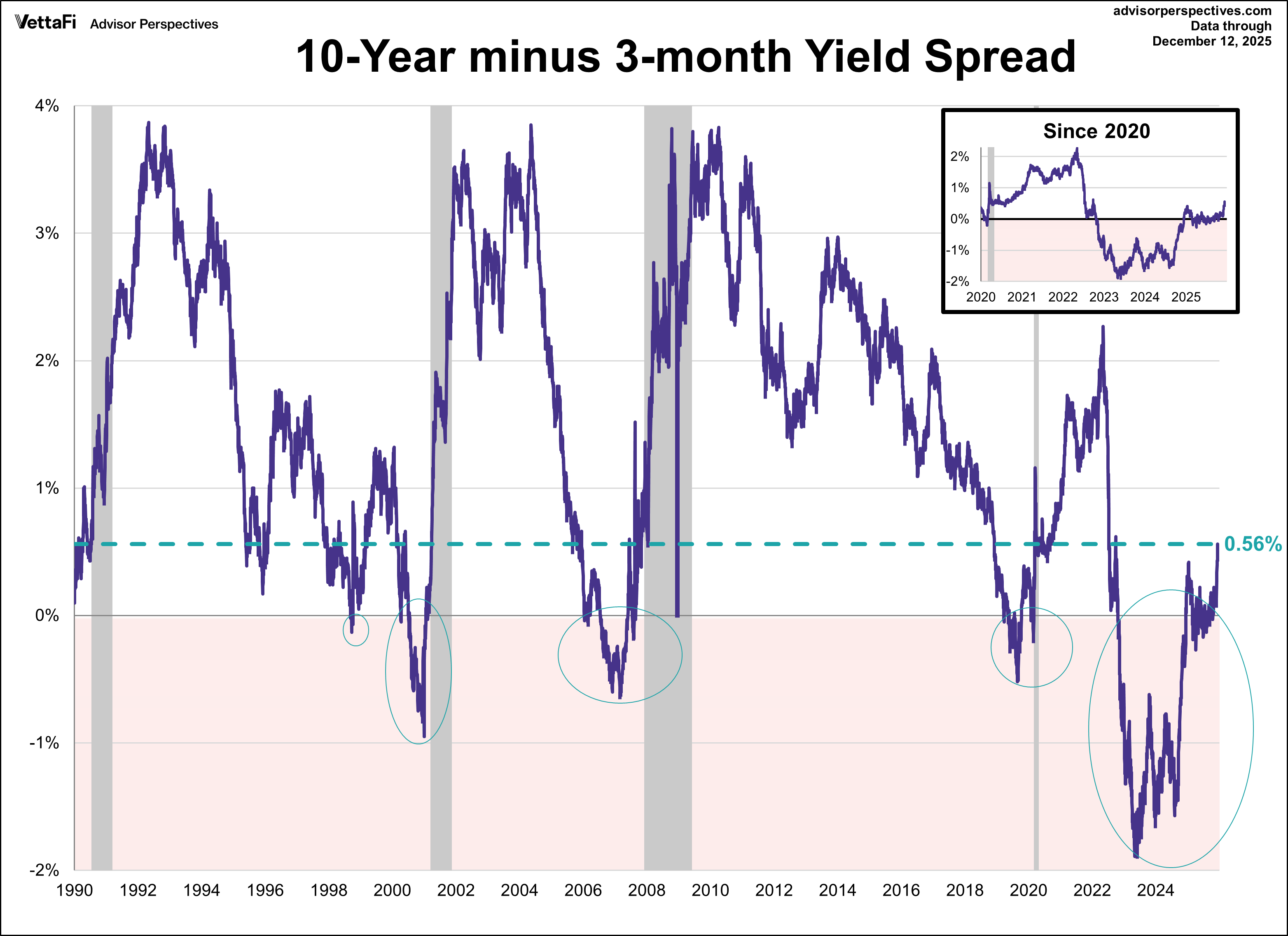 One false positive is seen in 1998, where the spread briefly went negative without leading to a recession. In the case of the 2009 recession, the spread went negative multiple times before rising again. Most recently, the spread was continuously negative from July 5, 2022, to August 26, 2024. The last time the spread was negative was on September 5, 2024.