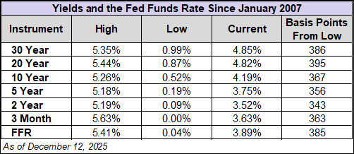The yield on the 10-year note finished December 12, 2025 at 4.19%. Meanwhile, the 2-year note ended at 3.52% and the 30-year note ended at 4.85%.