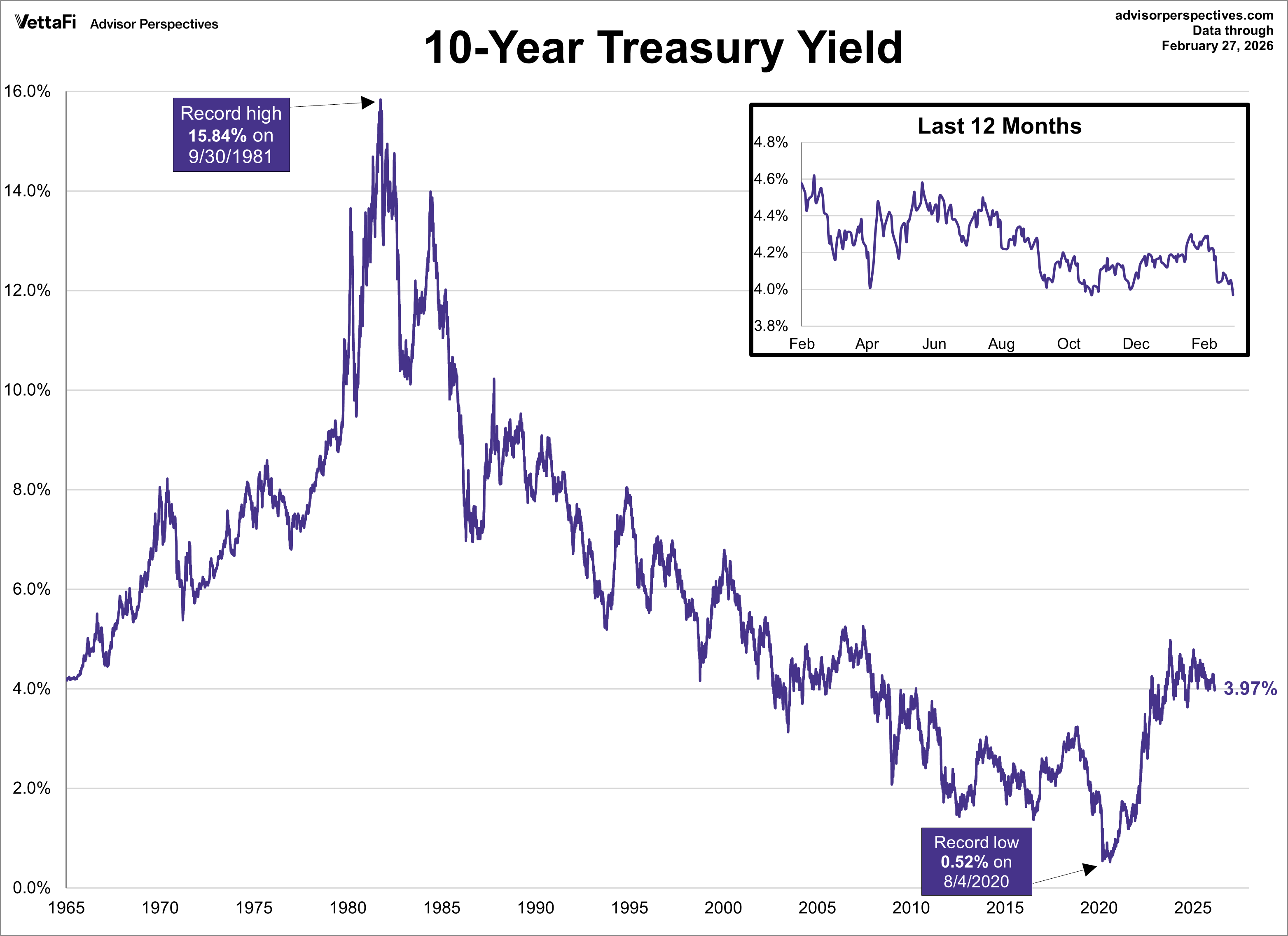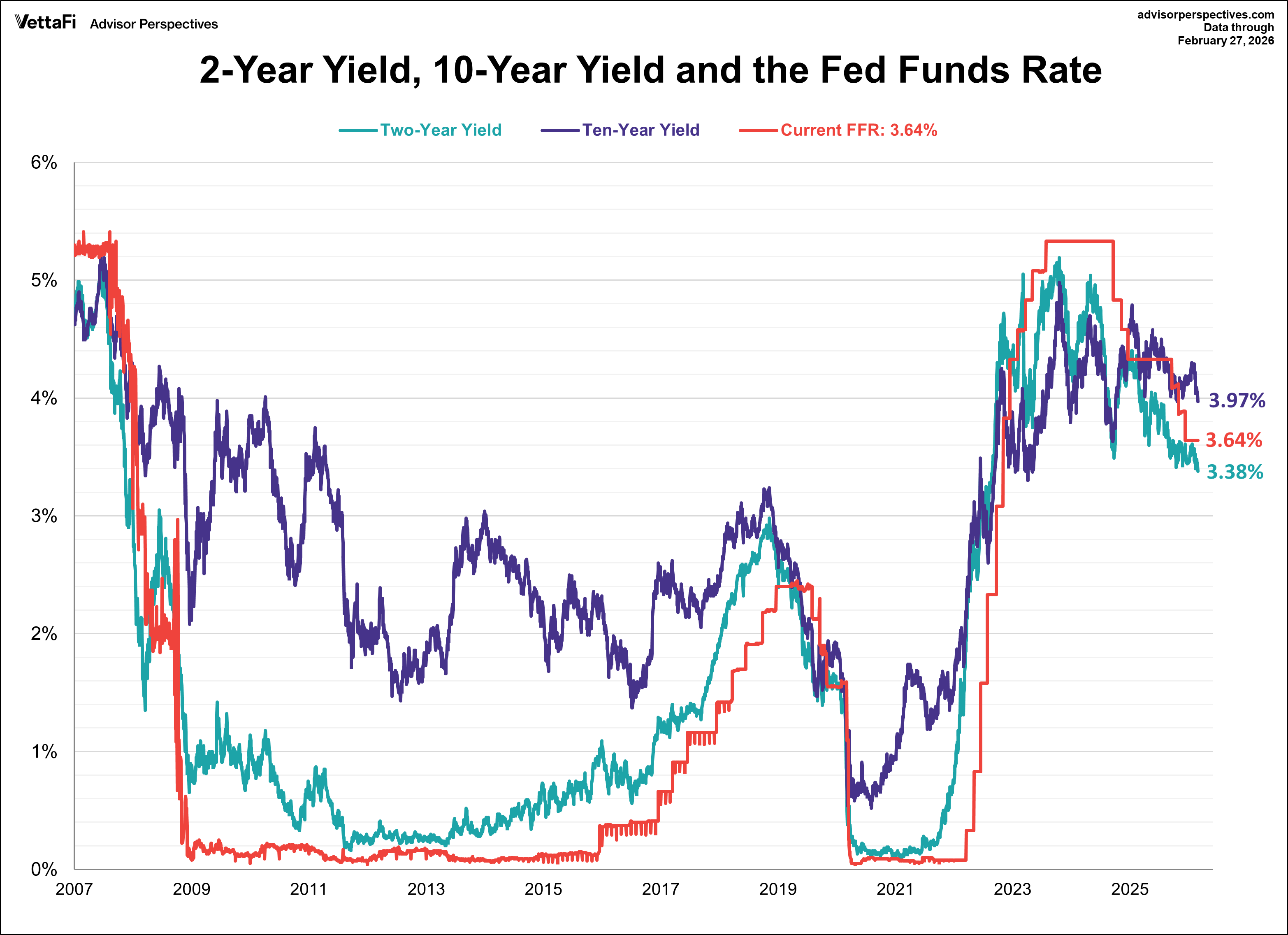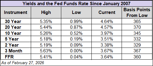 The yield on the 10-year note finished February 27, 2026 at 3.97%, its lowest level in four months. Meanwhile, the 2-year note ended at 3.38%, its lowest level since August 2022.
